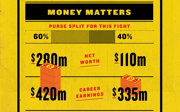 | Số tiền Mayweather kiếm được trong sự nghiệp thi đấu là 420 triệu USD. Trong khi Pacquiao cũng thu về 335 triệu USD từ những lần so găng. Ảnh: Telegraph. |