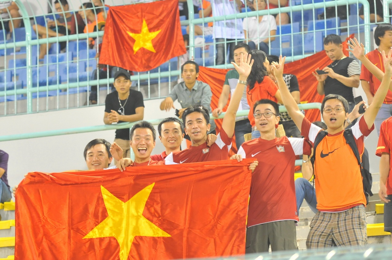 | CĐV Việt Nam học tập, làm việc và sinh sống tại Malaysia đến SVĐ cổ vũ đội tuyển với lá cờ đỏ sao vàng. |