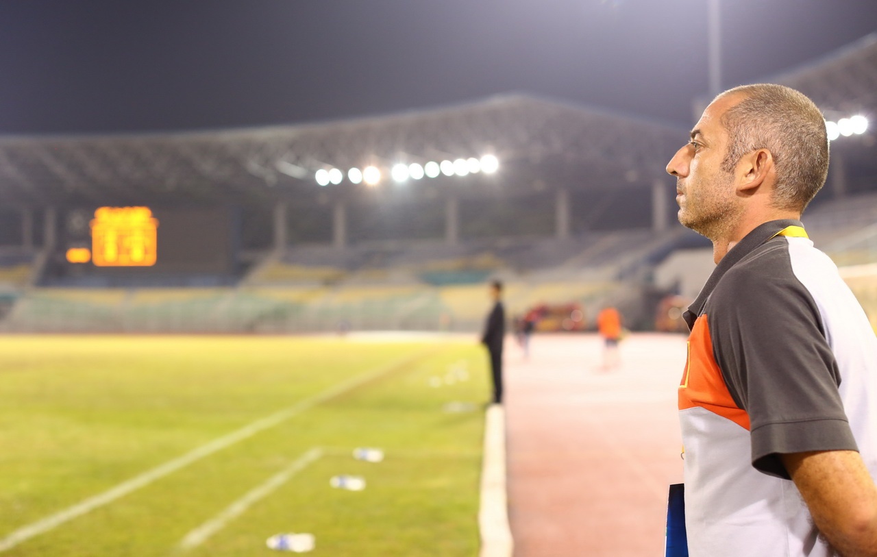 | HLV trưởng người Pháp chăm chú theo dõi các học trò thi đấu và ông luôn rất điềm tĩnh sau mỗi bàn thắng của học trò. |