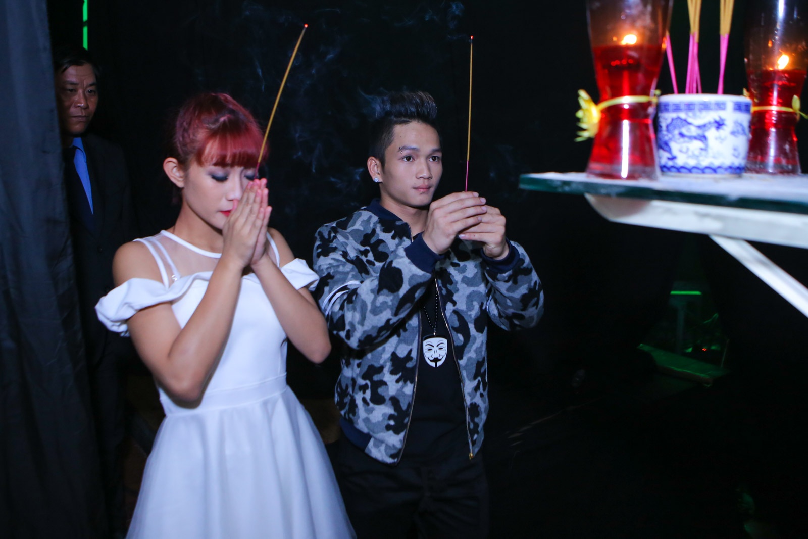 Hữu Phước và Trâm Anh thắp hương cho bàn thờ Tổ trước khi ra sân khấu. Top 4 sẽ có màn trình diễn solo 30 giây trước khi nghe Trấn Thành công bố kết quả. |