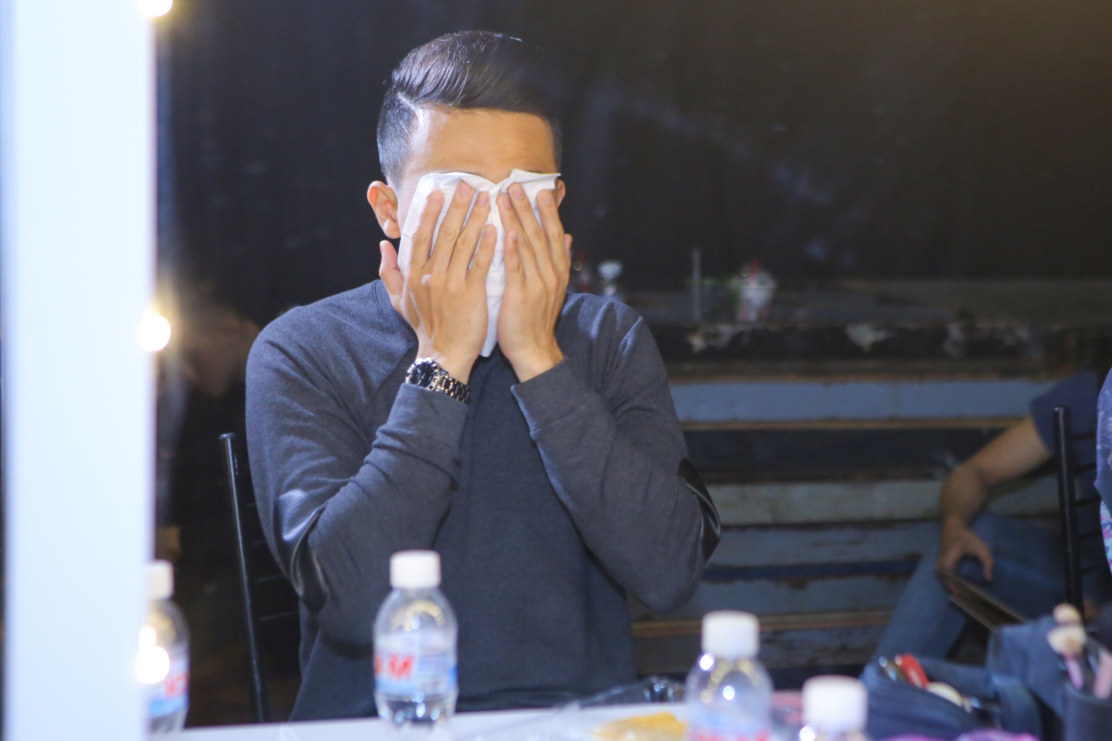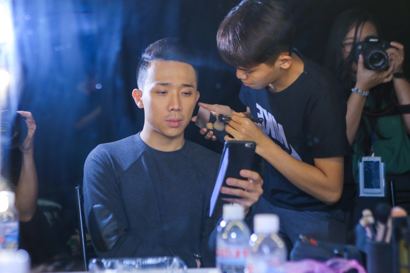 Trấn Thành có mặt tại Nhà thi đấu Maximark Cộng Hòa, TP HCM từ khá sớm để chuẩn bị cho đêm trao giải. Nam nghệ sĩ nhiều lần khó chịu vì trường quay bị mất điện trong lúc anh đang make-up và xem lại kịch bản. |