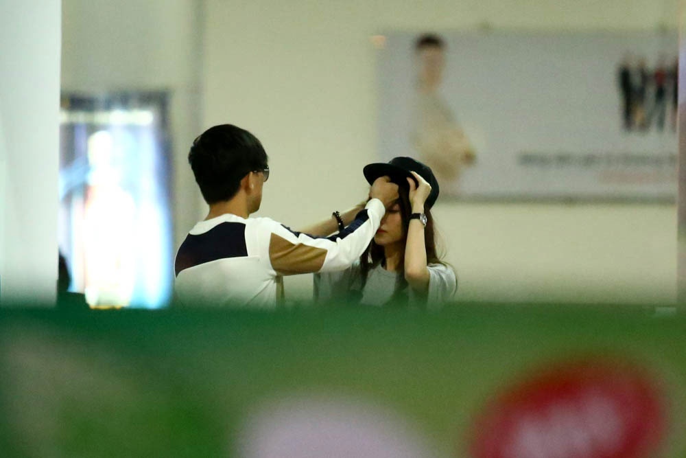 | Trấn Thành chăm sóc bạn gái chu đáo. Anh vén tóc, giúp người yêu đội mũ. |