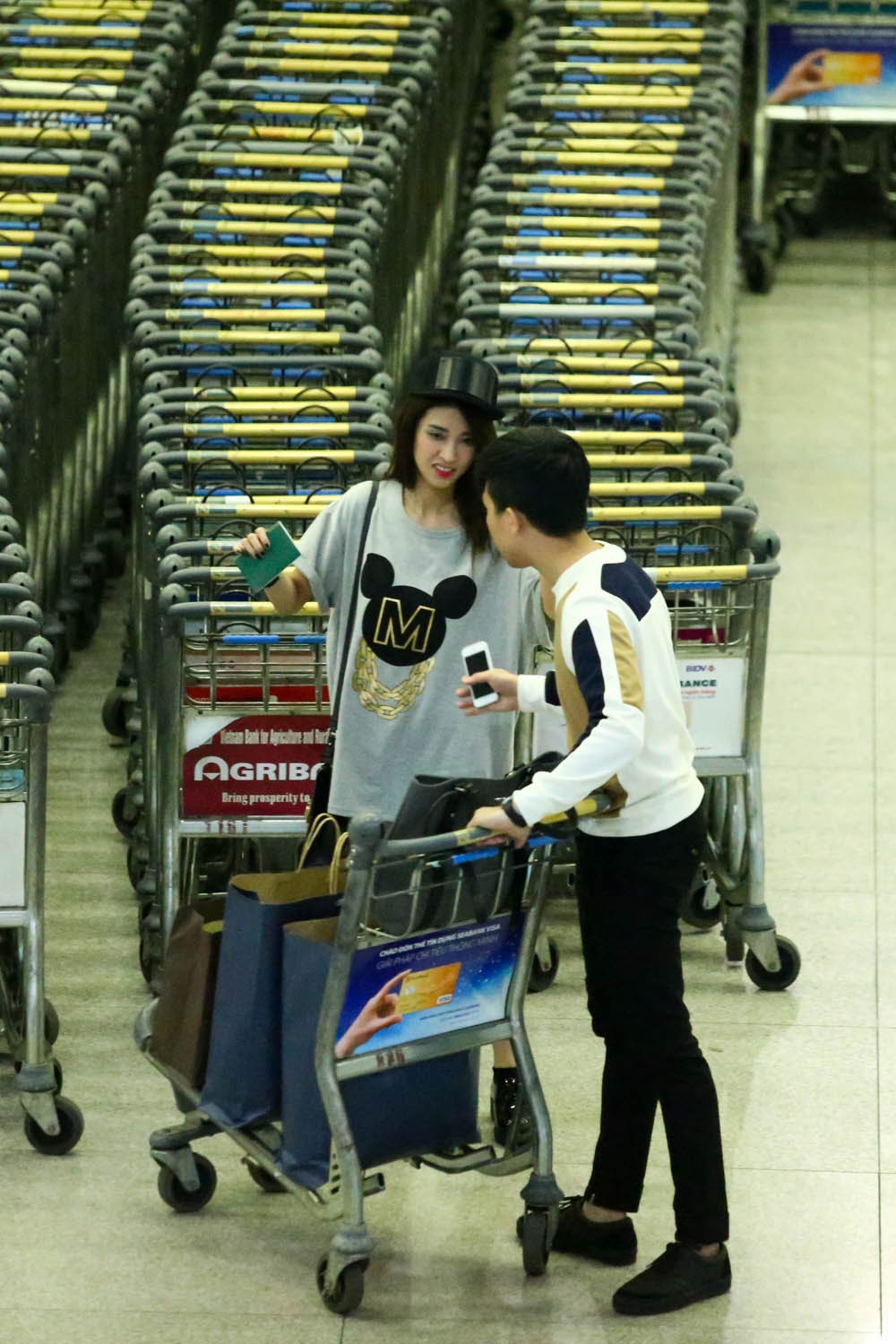 | Nữ ca sĩ trêu chọc MC Anh Khoa trong lúc chờ lấy hành lý. |