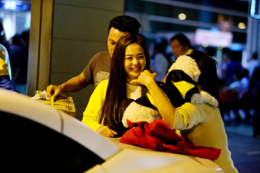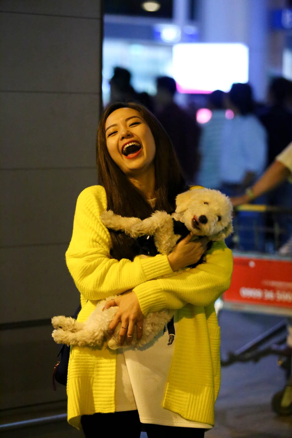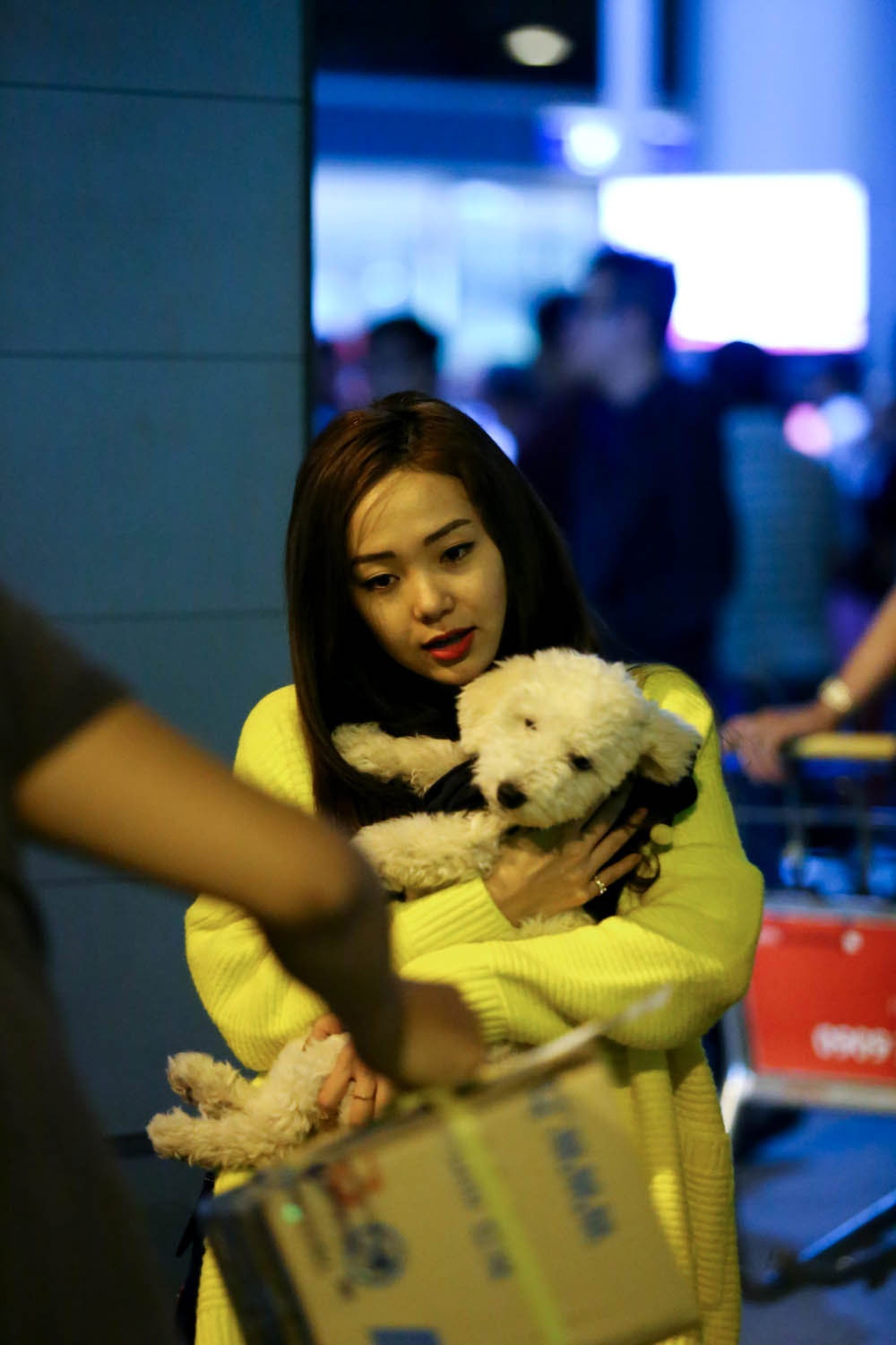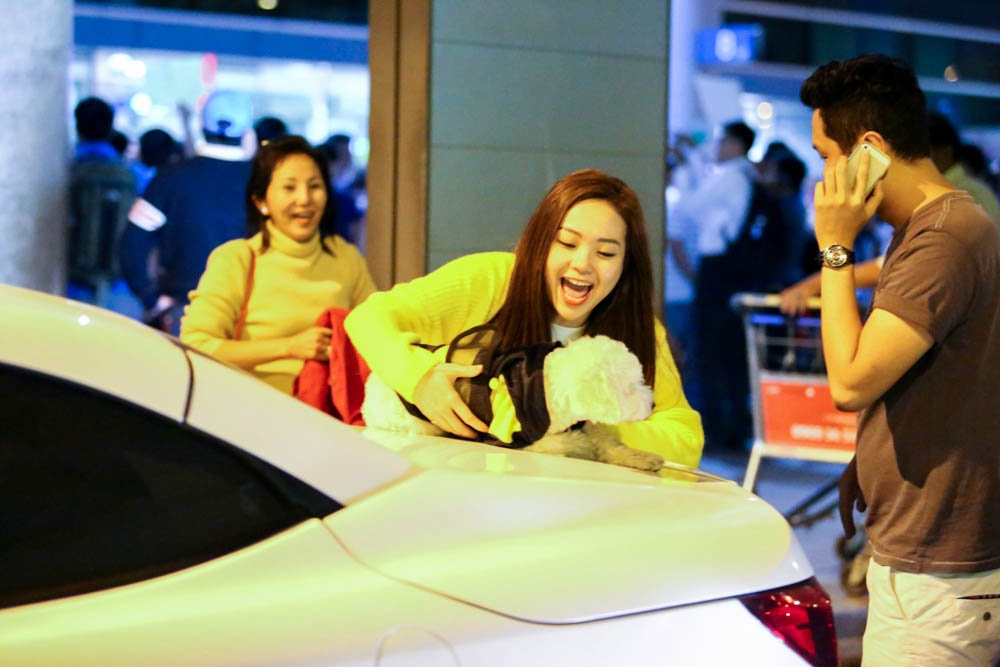 | Người đẹp được em trai đưa cún cưng ra sân bay để đón. Cô vội bế Santa vào lòng. Minh Hằng là một trong những nghệ sĩ rất thích nuôi chó cảnh. Cô cho biết, mỗi khi rảnh đều ở nhà chơi với chú cún này. |
