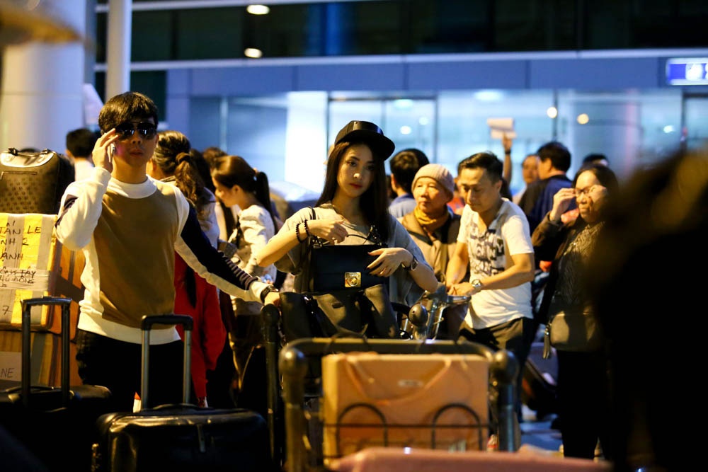 | Nữ diễn viên Ngôi nhà hạnh phúc cười khi vừa xuống sân bay Tân Sơn Nhất, sau 5 ngày ở Hàn Quốc dự sự kiện và tham quan phim trường Bản tình ca mùa đông. |