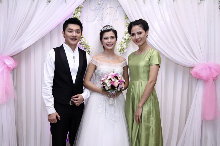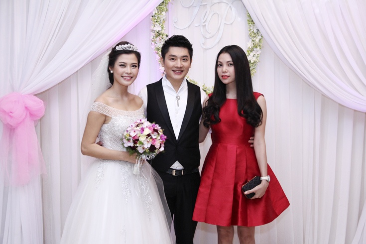 | Ngoài Trấn Thành, đến chung vui với người dẫn chương trình điển trai có đông đảo các sao Việt trong showbiz. Hoa hậu thể thao 2008 Trần Thị Quỳnh dịu dàng trong mẫu đầm màu xanh mát mắt. Cô chụp ảnh bên đôi vợ chồng trẻ. |