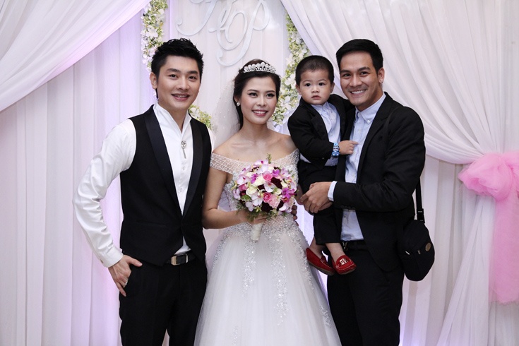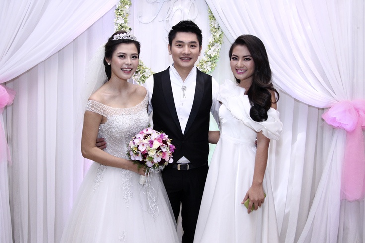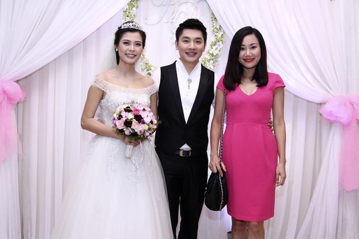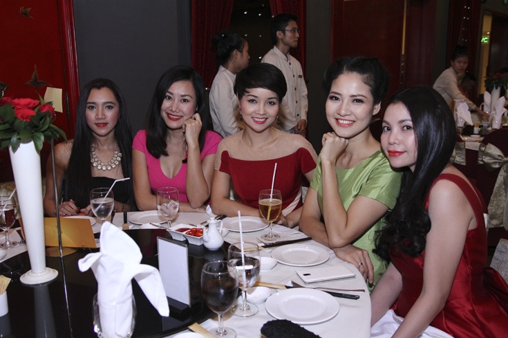 | Dàn người đẹp của showbiz cùng tạo dáng bên bàn tiệc cưới. |