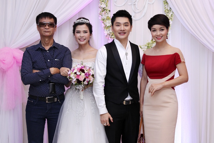 | Vợ chồng nam MC Tuấn Anh chụp ảnh kỷ niệm cùng đạo diễn Lê Hoàng và diễn viên Mai Thu Huyền. |