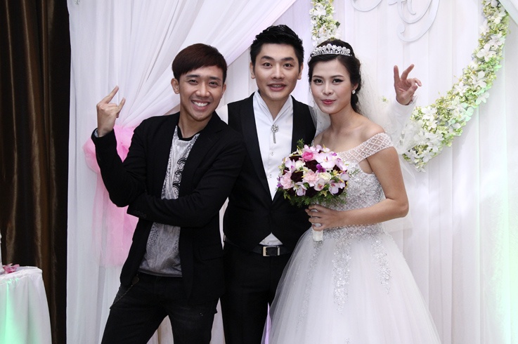 | Chọn cho mình trang phục khá giản dị với gam màu trầm, Trấn Thành nhí nhảnh tạo dáng, chụp ảnh kỷ niệm với vợ chồng người đồng nghiệp. Cô dâu, chú rể cũng bị "cuốn theo" sự xì-tin của danh hài và biểu cảm đáng yêu. |
