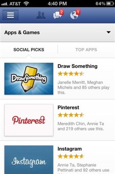 2012: Trung tâm ứng dụng của Facebook Để đáp ứng lượng người dùng trên các thiết bị di động ngày càng tăng, trong năm 2012 Facebook đã cho ra đời App Center. Với hơn 500 ứng dụng trên Facebook, chủ yếu là trò chơi. |