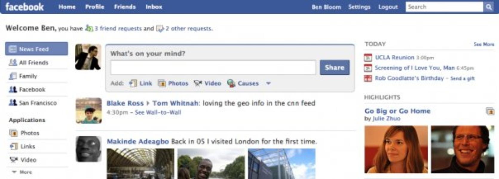 2008: Trang chủ của Facebook ra đời Một trang giao diện mới chào đón người dùng với kiểu dáng và phong cách đẹp hơn cho số lượng fan ngày càng tăng của Facebook. |
