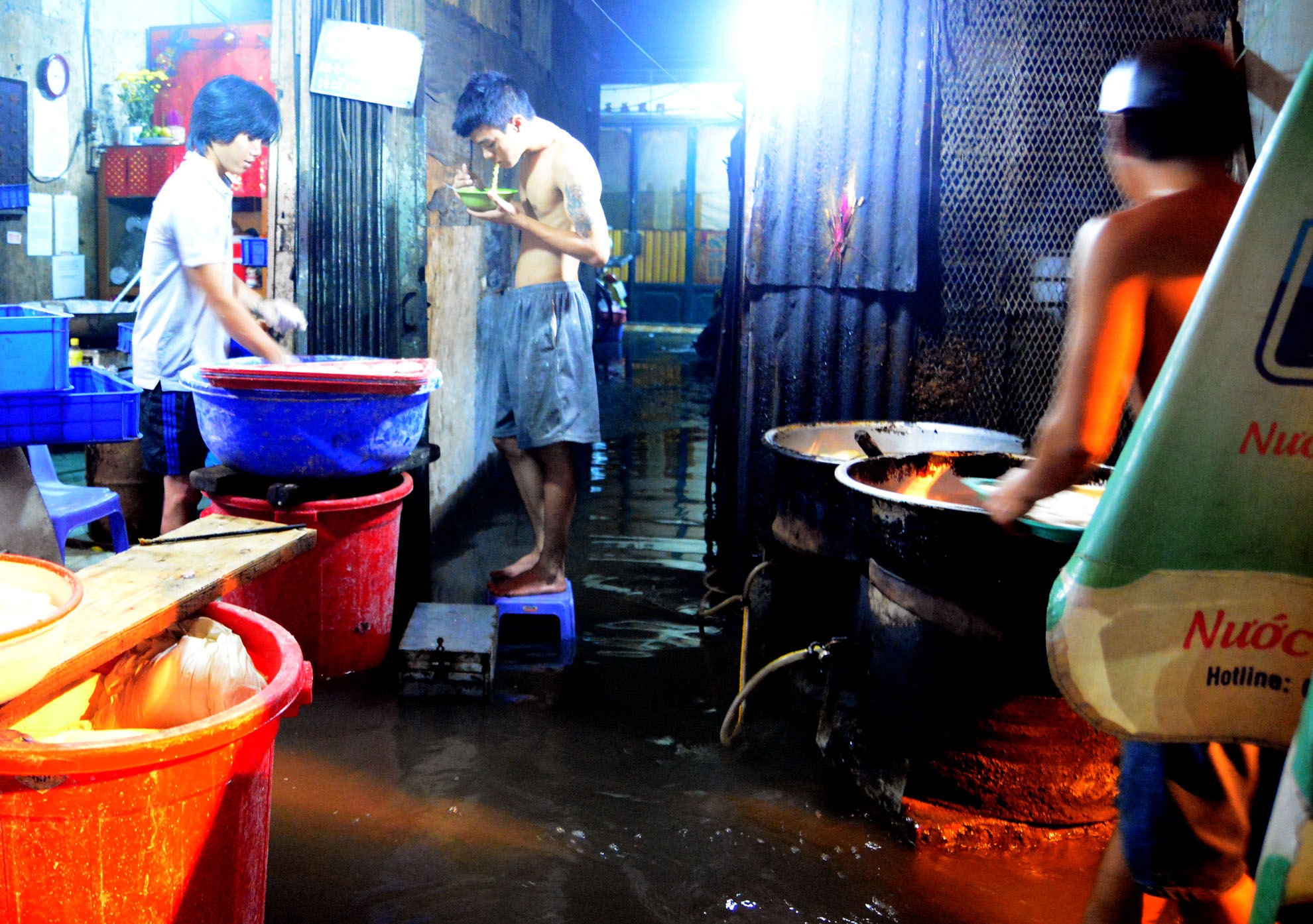 | Lý Khánh Linh, 20 tuổi làm thợ bánh mì trên đường Phan Anh, quận Bình Tân đứng trên ghế ăn tạm bát mì cho qua cơn đói. "Mưa lớn từ chiều không đi ăn cơm được, tôi ăn tạm tô mì gói rồi làm tiếp chờ tới sáng nước rút đi ăn luôn", Linh cho biết. |