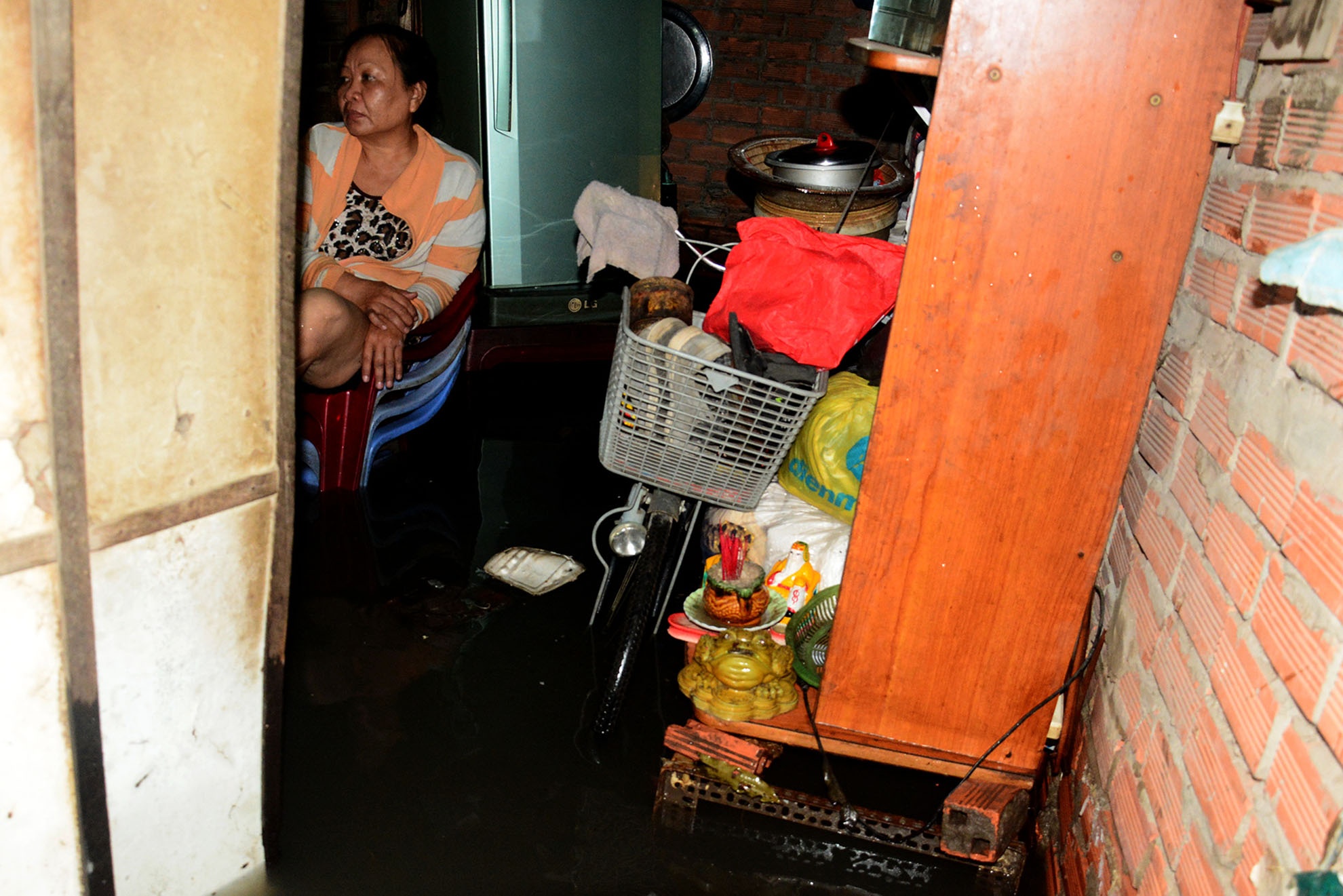 | Bà Nguyễn Thị Năm (46 tuổi), ngụ đường Mã Lò, quận Bình Tân ngồi trên ghế khi bị nước bao vây căn nhà. Bà cho biết: "Mặc dù kê đồ đạc lên rồi nhưng nước ngập quá cao khiến mọi thứ đều bị ướt, gia đình chỉ biết chờ nước rút để dọn dẹp chứ không có chỗ ngủ". |