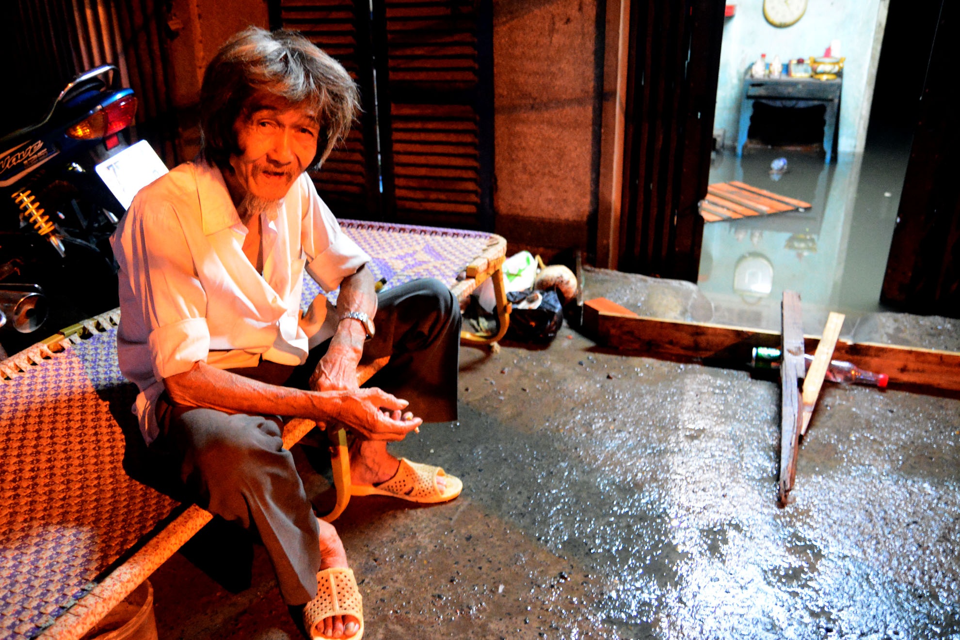 | Ông Khưu Trấn Triệu (72 tuổi) ngụ đường An Dương Vương, phường 13, quận 6 phải nằm tạm ở ngoài vì trong nhà ngập nước sâu gần 1 m vẫn chưa rút. |