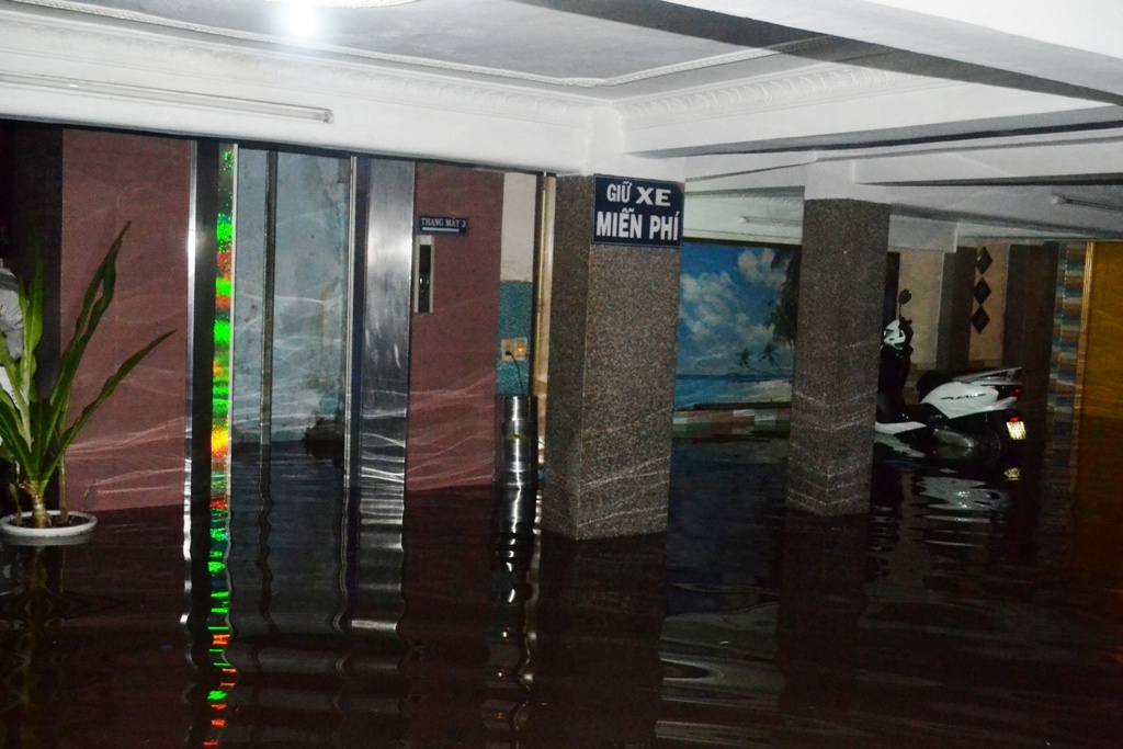 | Khu vực hầm xe và thang máy của khách sạn Nhật Bình vẫn còn ngập lúc 1h sáng 16/9. Theo công ty TNHH MTV Thoát nước đô thị thành phố, lượng mưa chiều tối 15/9 tại trạm Cầu Bông (quận 1) là 116 mm, trạm Quang Trung (Gò Vấp) 72 mm, Lý Thường Kiệt (quận 11) 78 mm, trạm An Lạc (Bình Tân) 105 mm, Phan Văn Khỏe (quận 6) 83 mm. Đây là trận mưa lớn nhất từ đầu năm tới nay. Dự kiến trong những ngày tới, Sài Gòn tiếp tục xuất hiện nhiều cơn mưa lớn. |