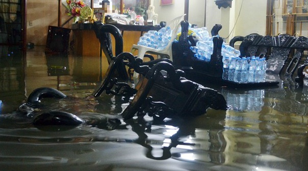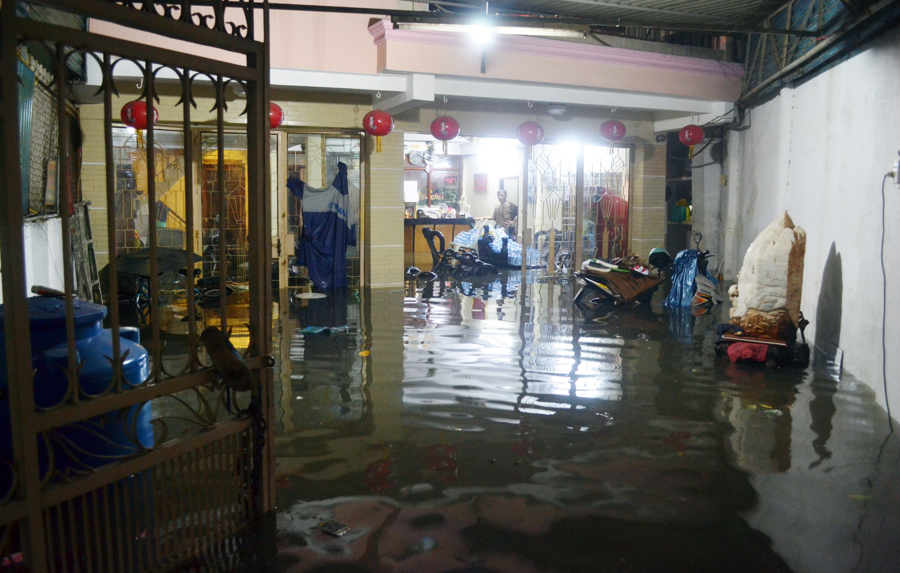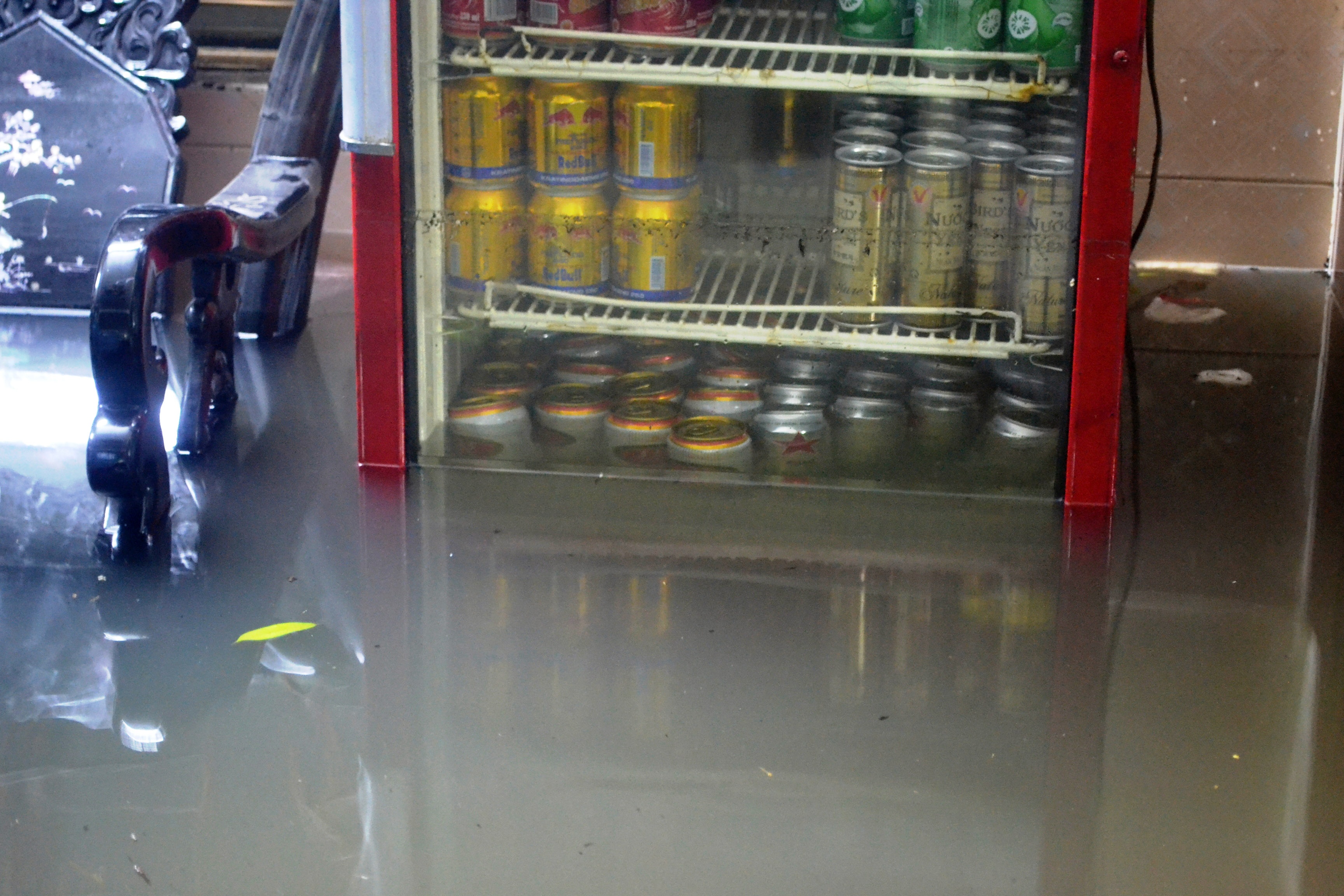| Chủ một khách sạn cho biết, đỉnh điểm lúc 18h, ngôi nhà này bị ngập khoảng 1,2 m trong làn nước hôi thối vì nền nhà thấp hơn mặt đường. Các nhân viên nhanh chóng di dời nhưng một số tài sản vẫn bị hư hỏng do nước tràn vào quá nhanh dù chủ khách sạn đã dựng rào chắn cao hơn nửa mét. "Một năm, khu vực này bị ngập nặng do mưa khoảng 4-5 lần, hôm nay là nghiêm trọng nhất. Mọi hoạt động kinh doanh đều ngưng trệ và phải mất 1-2 ngày để dọn dẹp", người này nói. |