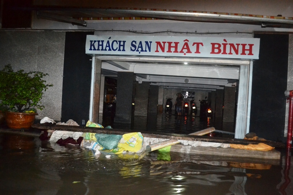 | Khách sạn Nhật Bình trên tuyến đường cũng bị ảnh hưởng nặng dù các cửa ra vào đều được xây "đập" chắn nước cao gần nửa mét. Suốt đêm, nhân viên khách sạn phải thức trắng tháo nước ra ngoài. |