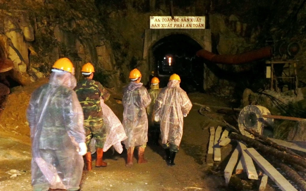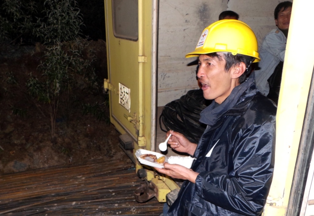 | Lúc 1h ngày 19/12, một tốp chiến sĩ cứu hộ tiến vào hầm để thay ca cho nhóm làm việc trước đó ra nghỉ ngơi và ăn uống. Ai cũng phải mặc áo mưa vì tường hầm liên tục rỉ nước dễ gây cảm lạnh. |