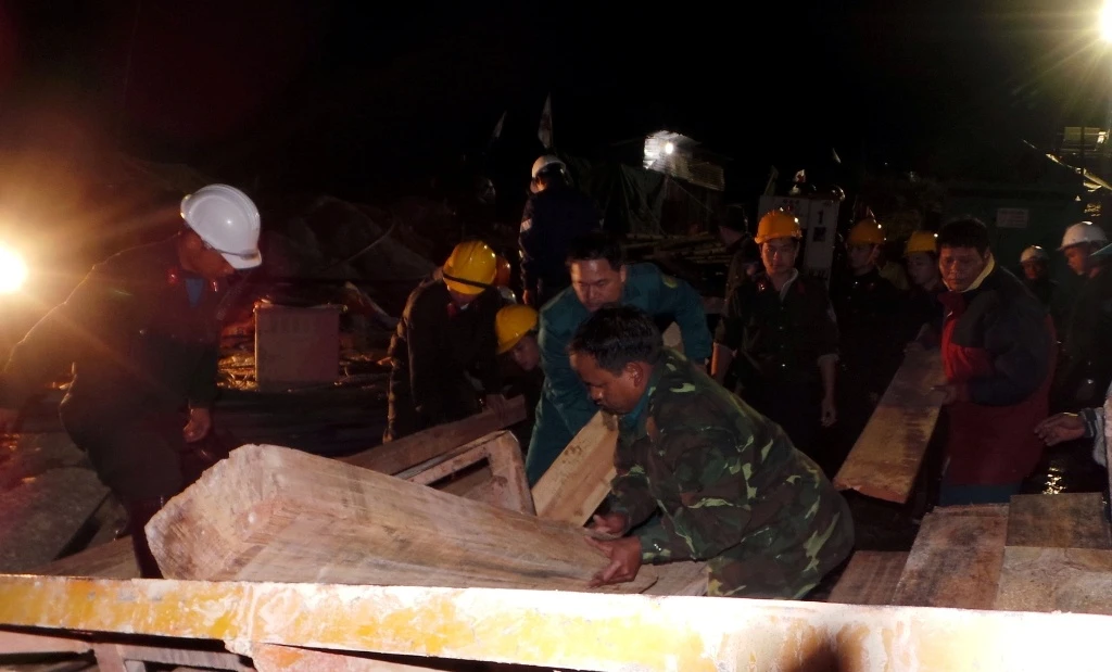| Gỗ thông liên tục được đưa về hiện trường để chèn chống những đoạn hầm phụ mới đào. |