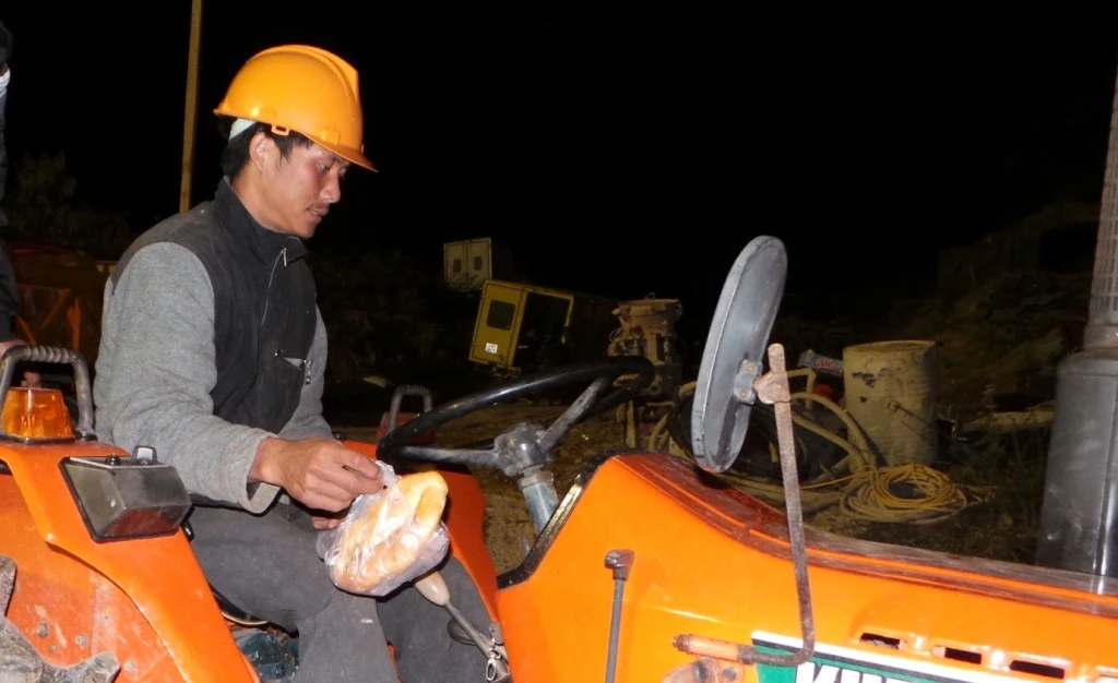 | Anh công nhân lái xe chở gỗ thông và sắt mang theo bánh mì cho những người khác đang làm việc trong hầm chưa thể ra ngoài ăn khuya. |