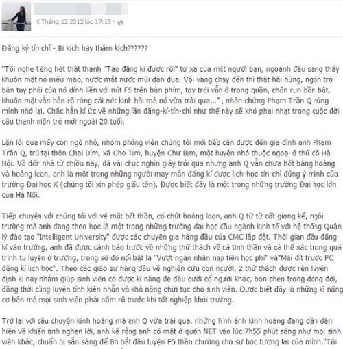 Trương Thương (sinh viên ĐH Luật Hà Nội) than thở: “Phải gọi là khủng khiếp mới đúng, để đăng kí được tín chỉ lần nào mình cũng phải thức trắng đêm”.