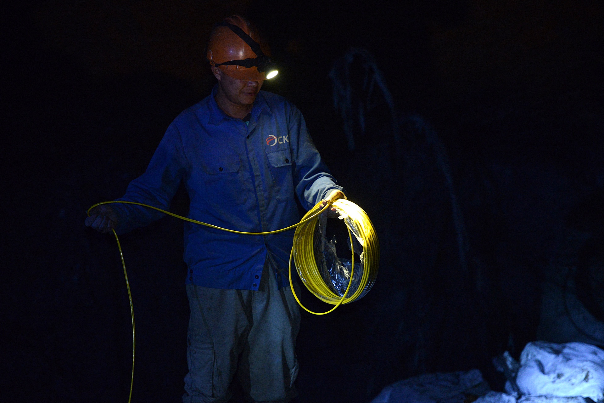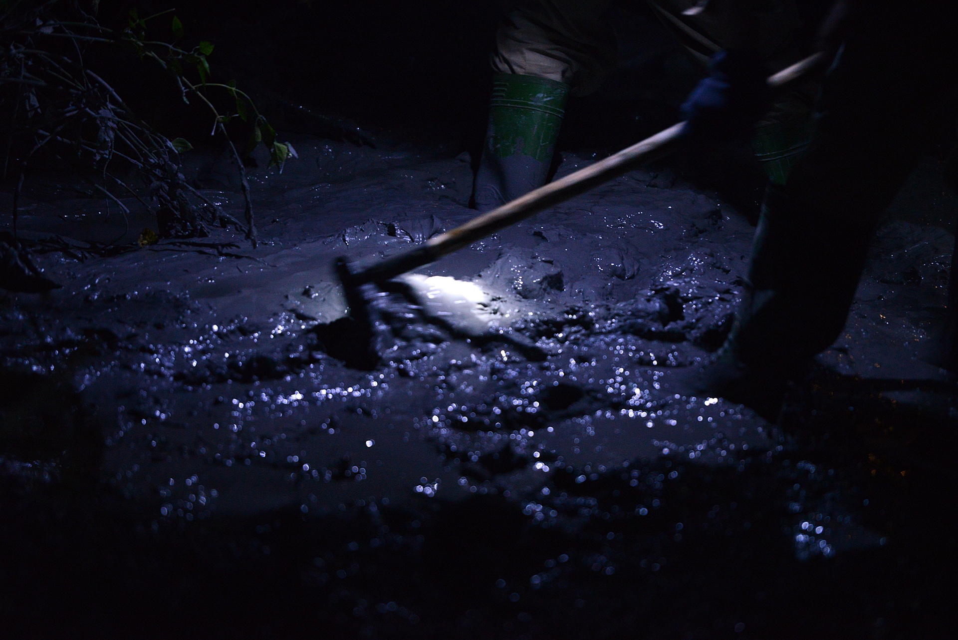 | Vừa vét bùn, công nhân vừa kéo điện để làm việc xuyên đêm. |