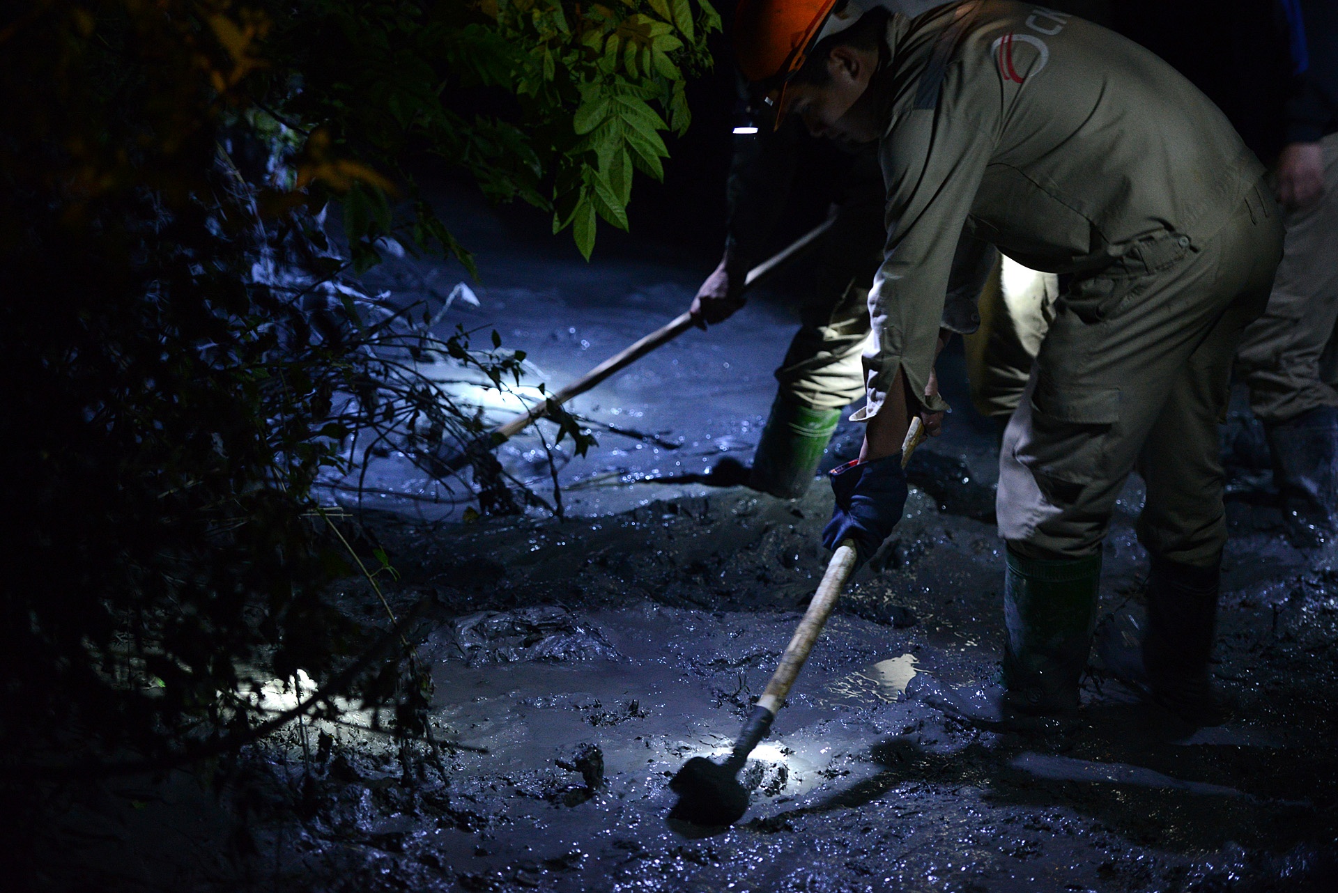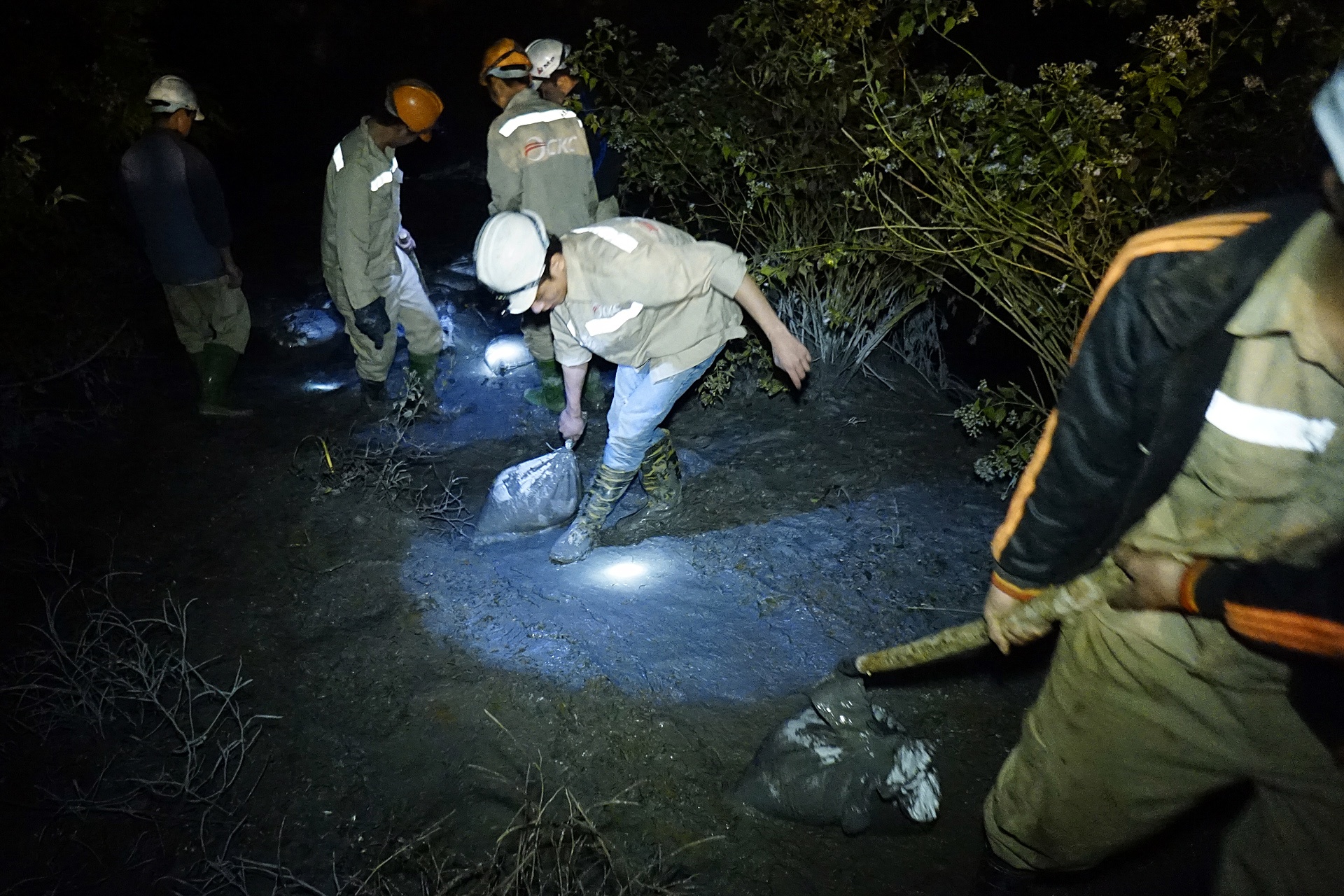 Đêm 6/1, hàng chục công nhân và người dân được huy động để vét bùn vào các bao tải nhỏ sau sự cố vỡ bể chứa nước, bùn thải chì, kẽm của Công ty TNHH CKC ở Cao Bằng.