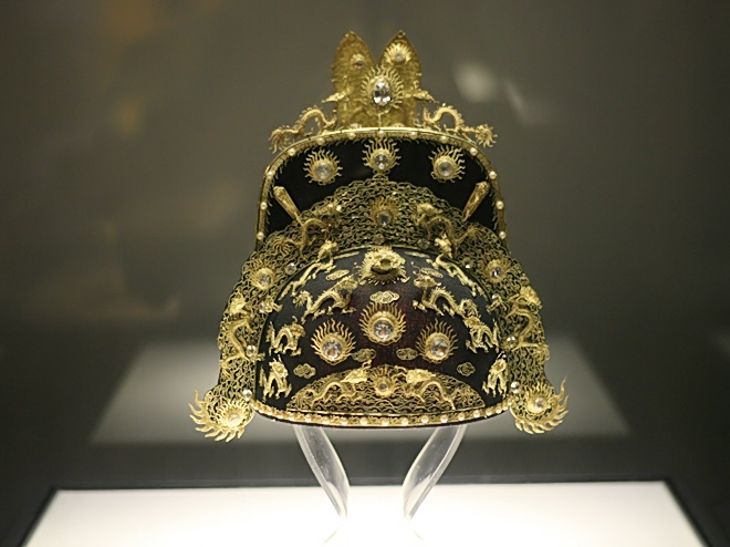 Mũ xung thiên (phục chế) làm bằng vàng, đá quý và vải có từ thế kỷ 19-20. Đây là mũ của vua triều Nguyễn, dùng đội trong những buổi thiết triều. Trang trí tinh xảo, hình rồng 5 móng, mây và mặt trời.