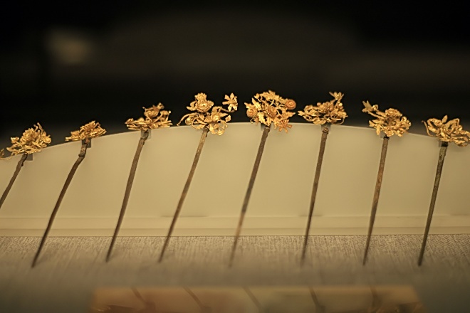 | Trâm hình cành hoa, đào, cúc được làm bằng vàng, bạc có từ thời chúa Nguyễn. Đây là trang sức cài tóc của phụ nữ hoàng tộc thời chúa Nguyễn. Đầu trâm gắn cành hoa đào, cúc có bướm, chồn chuồn đậu quanh. Từng chi tiết hoa văn được chạm, đậu tinh xảo, tỉ mỉ. |