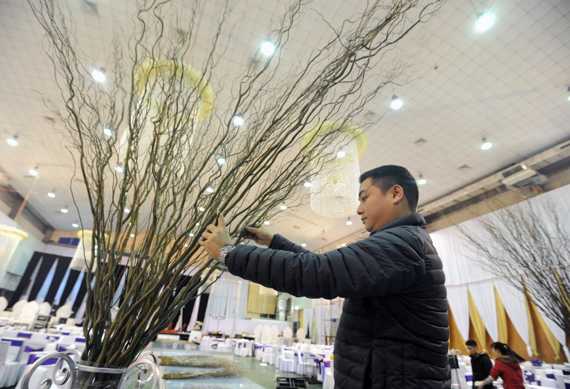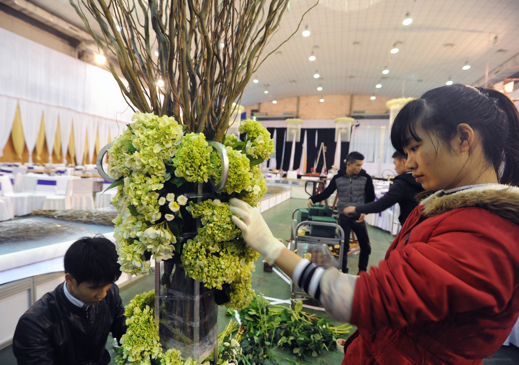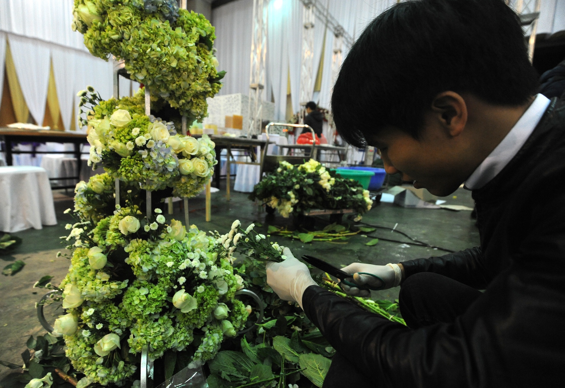 | Các bình hoa trang trí tại các bàn tiệc đã được cắm từ đầu giờ chiều 9/1. |