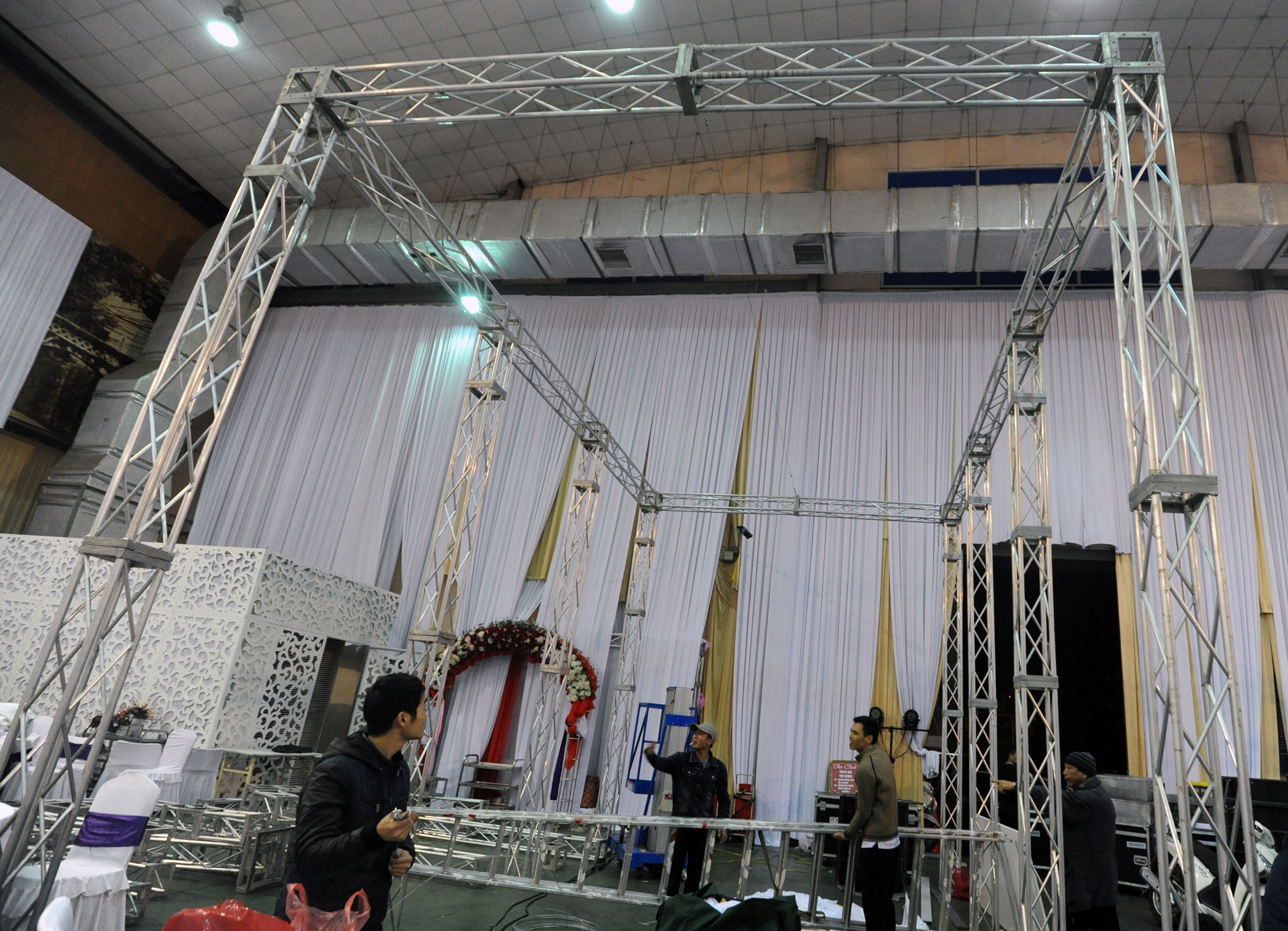 | Do ngoài trời mưa nên công tác chuẩn bị cổng hoa đón tiếp được dựng tạm trong khán phòng. Chiếc cổng hoa này được dựng bằng giàn không gian với diện tích gần 50m2 và có chiều cao gần 5m, sau khi trang trí xong xuôi sẽ được chuyển ra ngoài. |