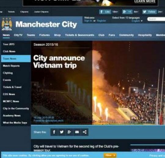 | Thông tin chuyến du đấu đến Việt Nam được tăng tải trên trang chủ của CLB Man City. Ảnh: Manchester City FC. |
