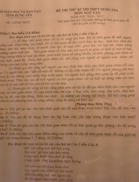 | Đề thi môn Ngữ văn kỳ thi thử THPT quốc gia của Hưng Yên năm 2015. Ảnh: VietNamNet. |