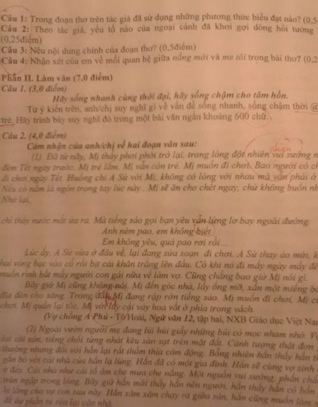 Trong phần II (làm văn), câu 1 – nghị luận xã hội, đề bài trích dẫn câu nói cũng không rõ nguồn gốc xuất xứ và nêu: “Từ ý kiến trên, anh/chị suy nghĩ gì về vấn đề sống nhanh, sống chậm thời @ của giới trẻ. Hãy trình bày suy nghĩ đó trong một bài văn ngắn khoảng 600 chữ”.