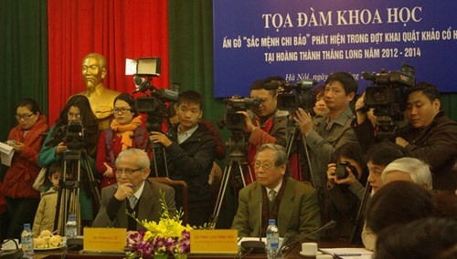 GS.TSKH Phan Huy Lê (người chống cằm) phản đối khai ấn và phát ấn tại Hoàng thành Thăng Long. |