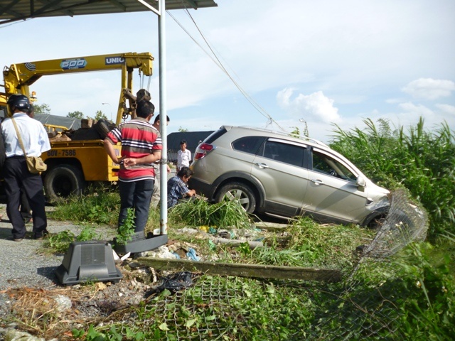 Vì đang chạy với tốc độ cao nên chiếc xe “đốn hạ” liên tiếp 12 cột bê tông và chỉ dừng lại sau khi tông vào hàng rào thép của một nhà dân. Tại hiện trường, chiếc xe bị nổ lốp sau, phần đèn và mui bị bể và méo mó. Rất may vụ tai nạn không gây thiệt hại về người.