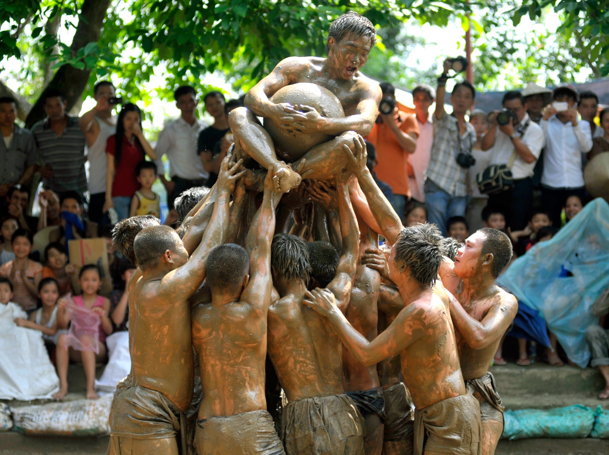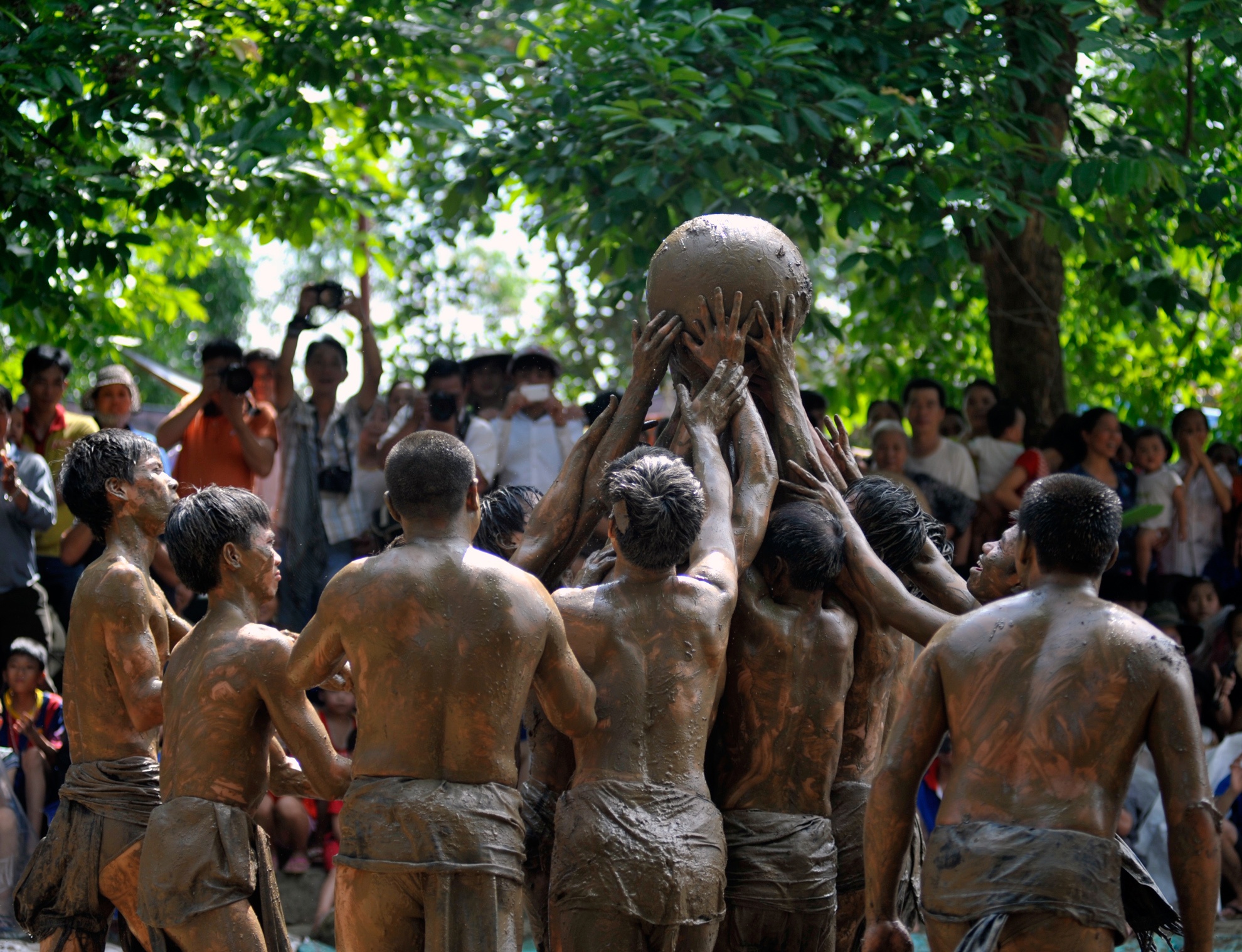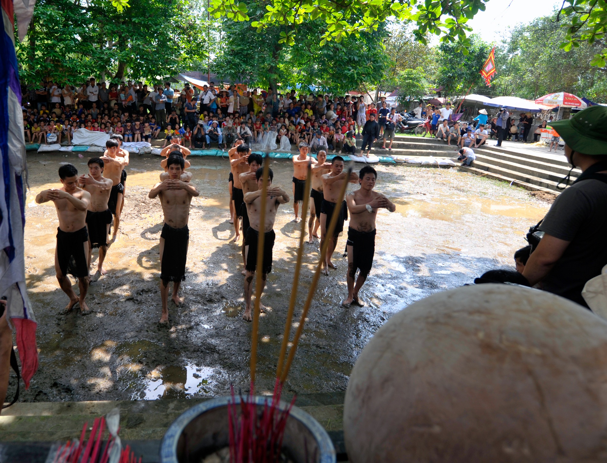 16 thanh niên khỏe mạnh được chia làm 4 giáp để thi tài vật quả cầu gỗ lim 20kg trên một sân rộng 200m2 đầy bùn nhão.
