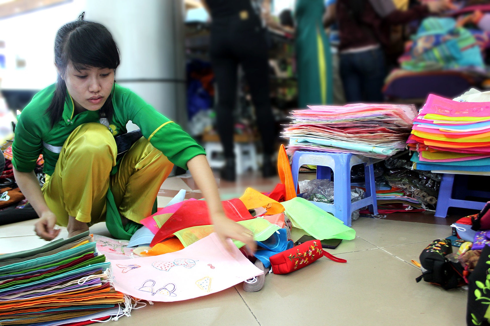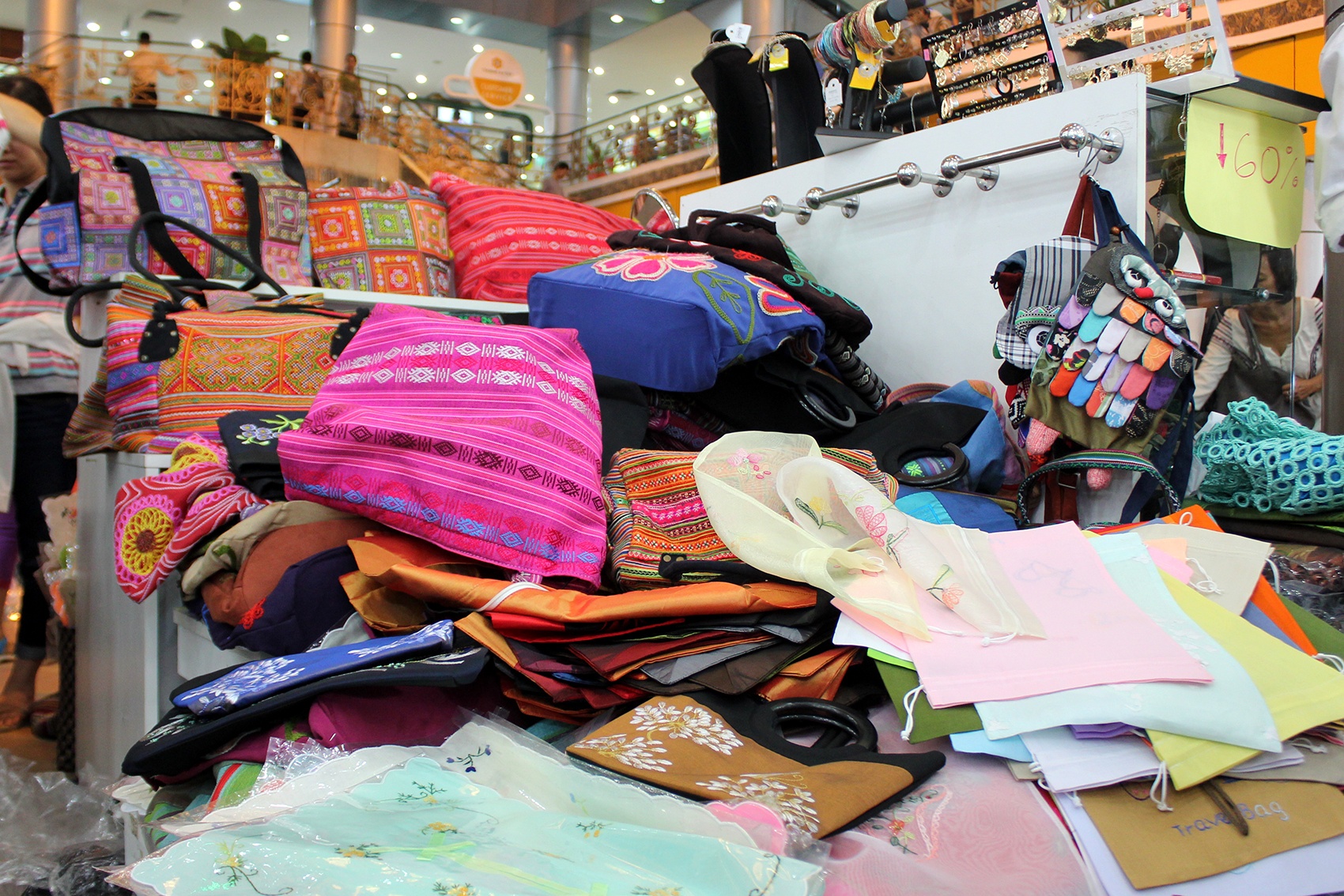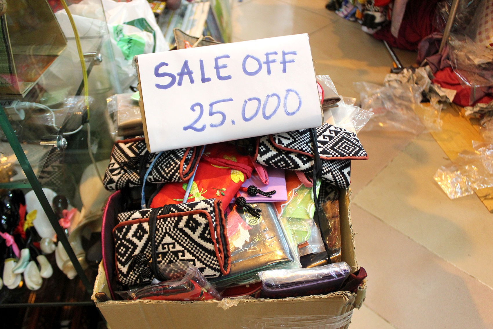 Quần áo, túi xách, khăn choàng.... được chất thành đống, với giá bán khá bình dân. Như các loại túi xách thổ cẩm này chỉ từ 150.000 đến 300.000 đồng/món, trong khi ngày thường chúng được nâng niu ngay ngắn trên những chiếc kệ sang trọng với giá bán khá cao.