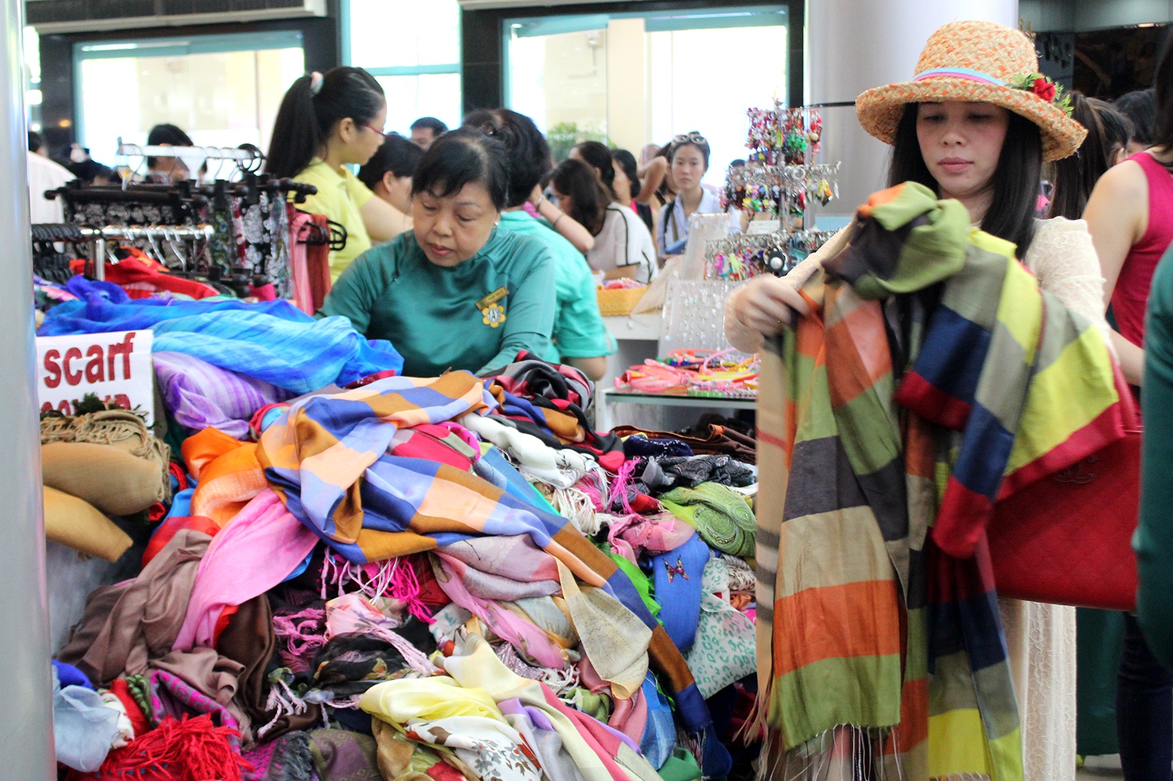 | Chị Thắm, một nhân viên văn phòng cho biết: "Có lẽ đây là cơ hội có một không hai. Ngày thường những mặt hàng này phần lớn đến hơn nửa triệu đồng mà giờ chúng chỉ có giá trên dưới 100.000 đồng. Tôi cùng bạn bè biết tin đã tranh thủ đến chọn mua ngay vài chiếc túi với khăn choàng mà ngày thường chỉ dám nhìn". |