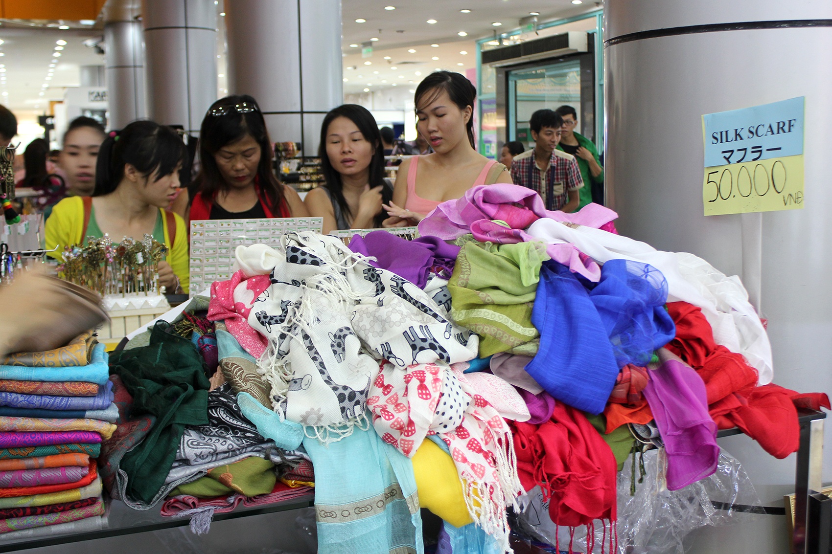 | Khăn choàng có giá từ 50.000 - 100.000 đồng/cái nên nhiều khách tranh thủ lựa cả chục cái. |
