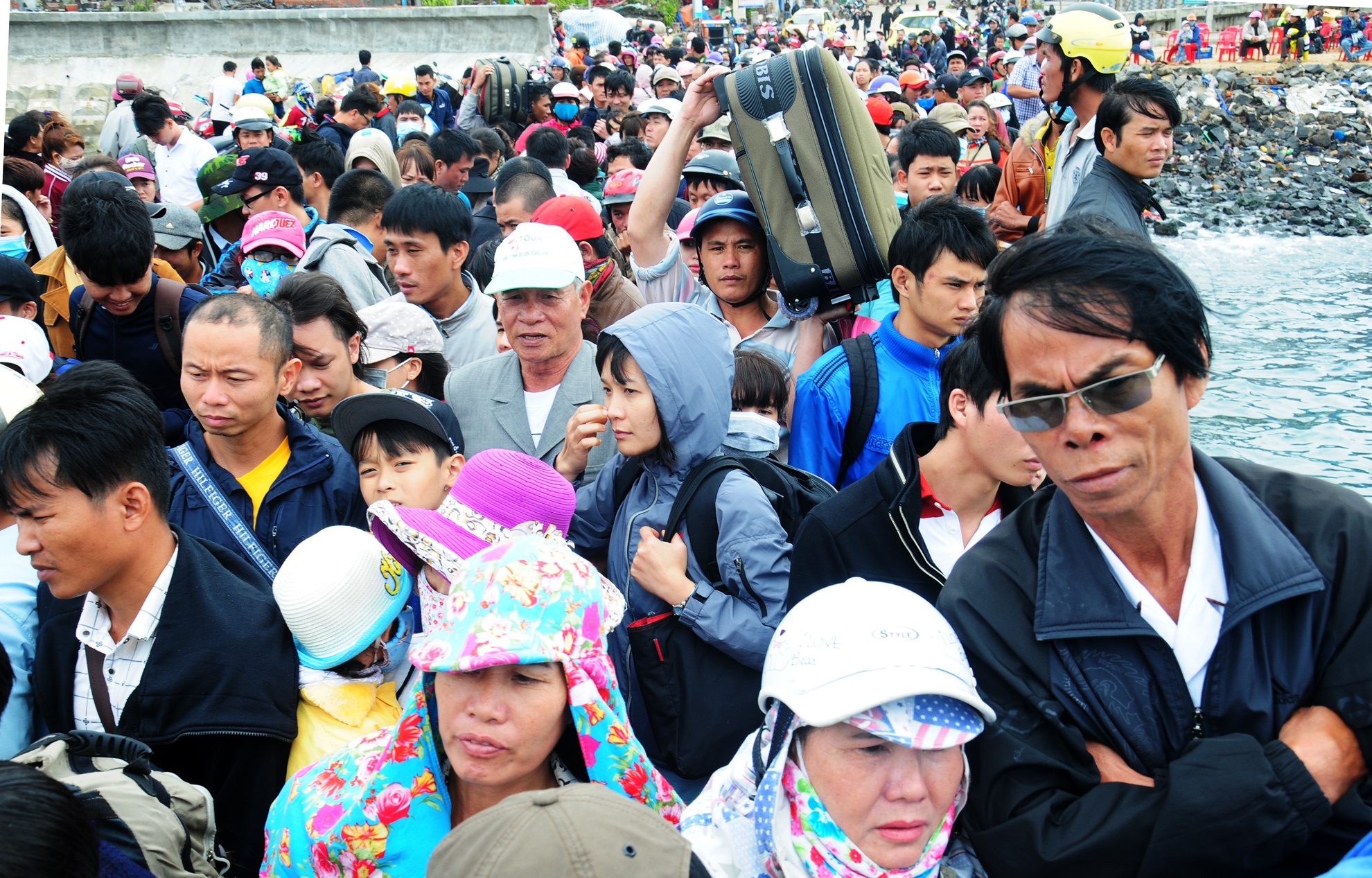 Sau hai ngày phờ phạc mắc kẹt do biển động mạnh, sáng 17/2, hơn 1.000 người dân cùng du khách tranh nhau lên tàu cao tốc rời huyện đảo Lý Sơn (Quảng Ngãi) vào đất liền.