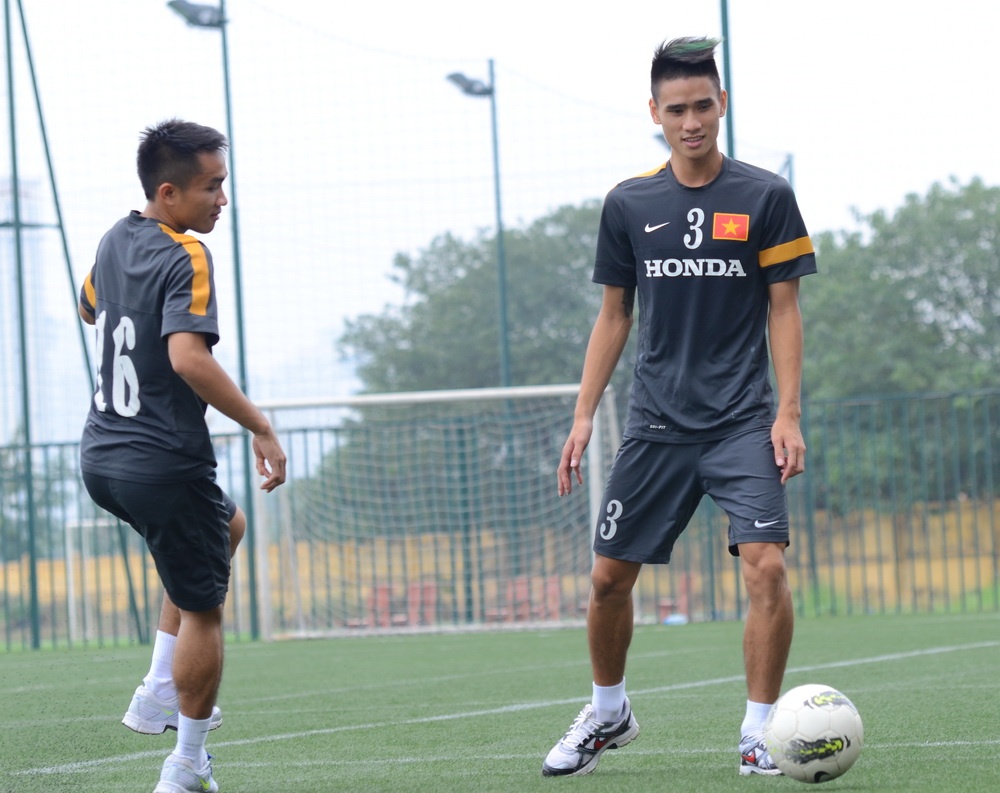 | Trung vệ Dương Thanh Hào đang gặp chấn thương bắp chân sau trận chung kết BTV Cup nên chỉ tập riêng để phục hồi. |