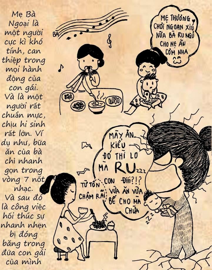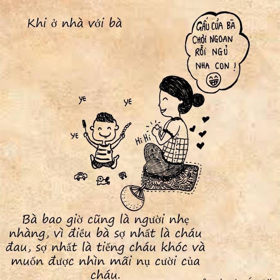 Bộ tranh của tác giả trẻ Út Bibe lột tả chân dung của bà ngoại - người luôn nâng niu, chăm sóc con gái và cháu mọi lúc, mọi nơi.