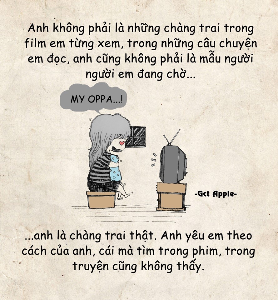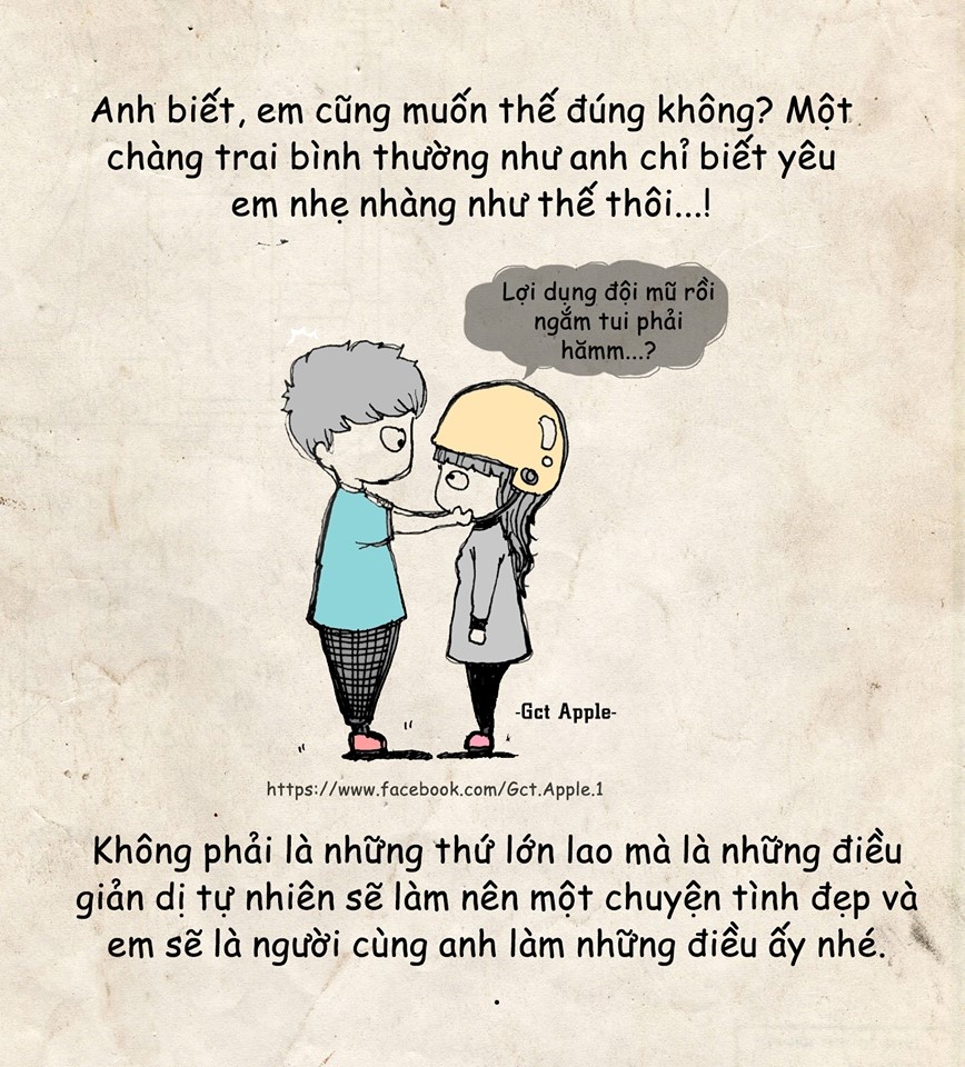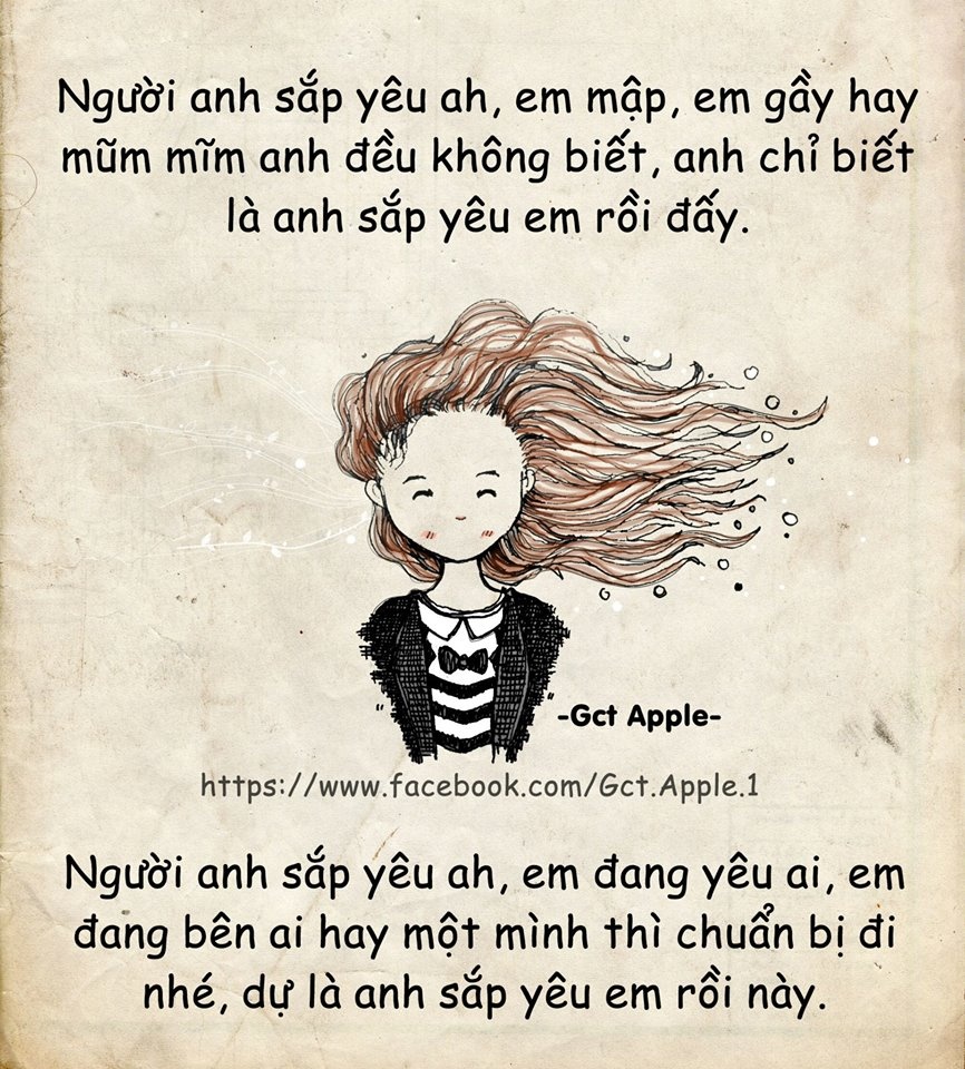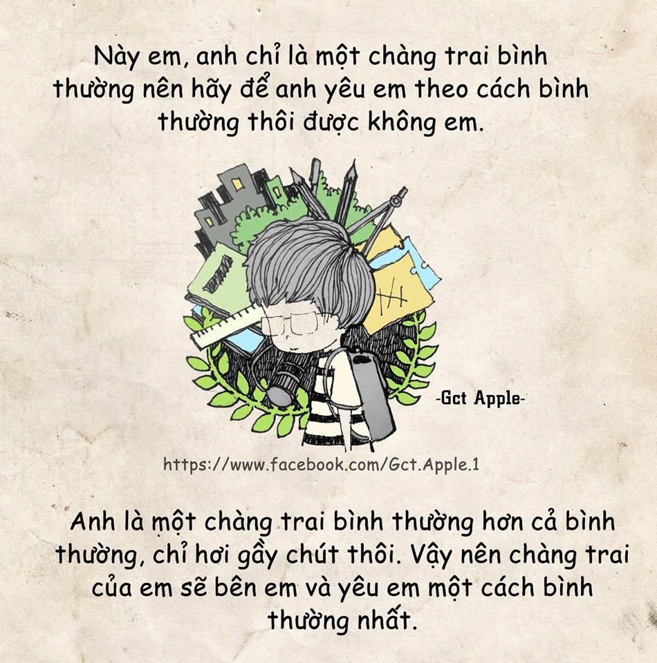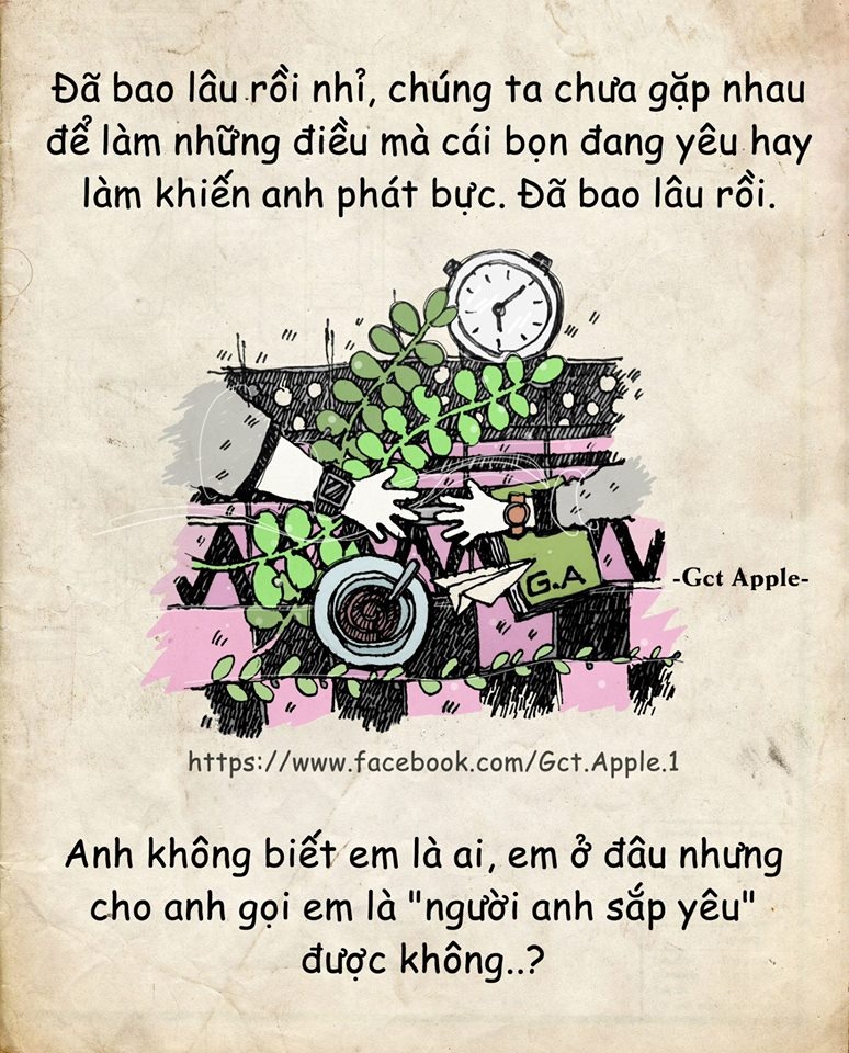 | Ngày 10/5, trên Facebook, Gct Apple (tên thật Vũ Hữu Nhân, sinh năm 1994, sinh viên Đại học Xây dựng Hà Nội) chia sẻ bộ tranh Gửi em... "Người anh sắp yêu". Mở đầu câu chuyện tình viễn tưởng là lời nhắn gửi từ chàng trai - "Cho anh gọi em là 'người anh sắp yêu' được không?". |
