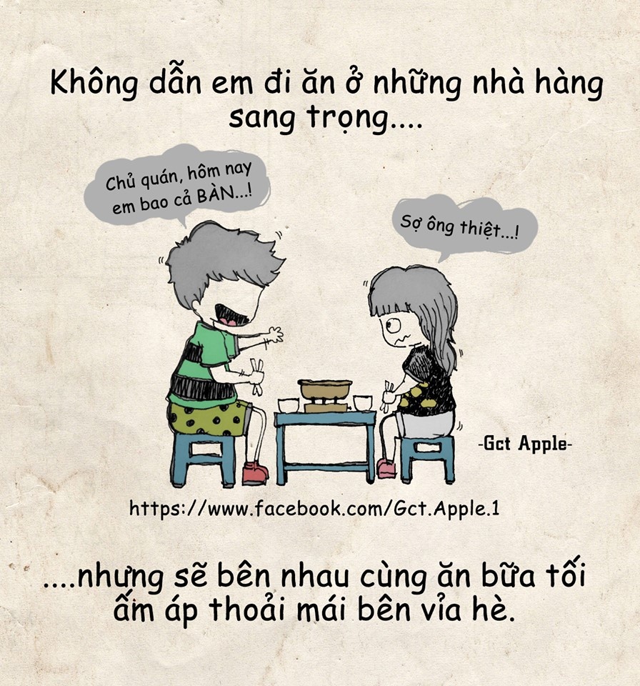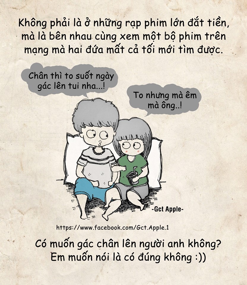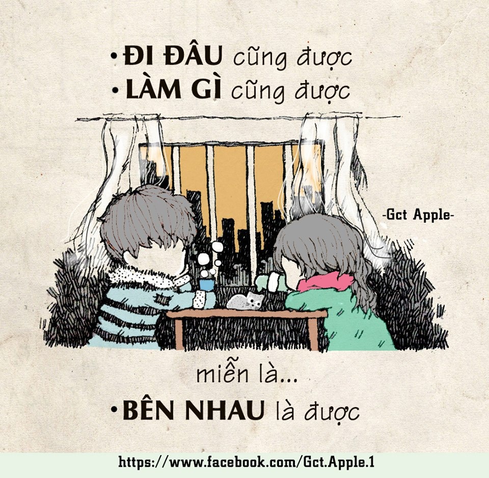 | Tác giả bộ tranh đưa ra quan niệm về tình yêu: "Đi đâu, làm gì cũng được. Miễn là mãi mãi bên nhau...". |