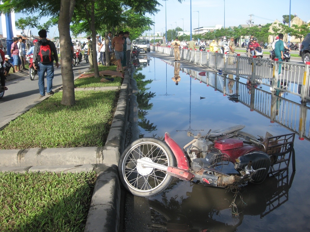 Người dân tại khu vực hiện trường cho biết, lúc 6h sáng, Lâm Vũ (17 tuổi, quê Sóc Trăng) điều khiển xe máy chở người bạn lưu thông trên đại lộ Võ Văn Kiệt hướng từ H.Bình Chánh vào trung tâm TP. Do đoạn đường xảy ra tai nạn đang ngập nước nên Vũ cho xe chạy sát mép dải phân cách bằng sắt ngăn 2 làn đường ô tô và xe máy.