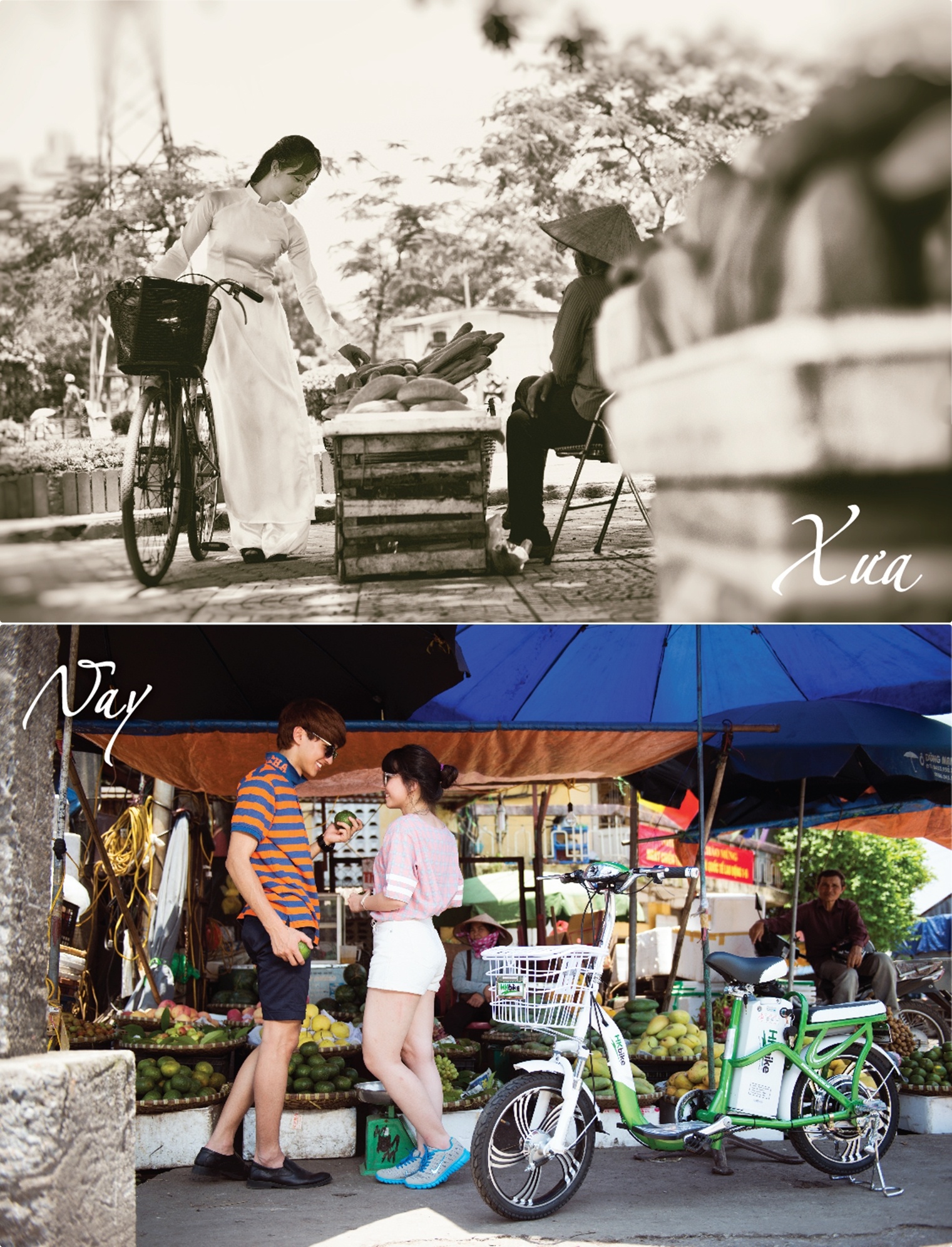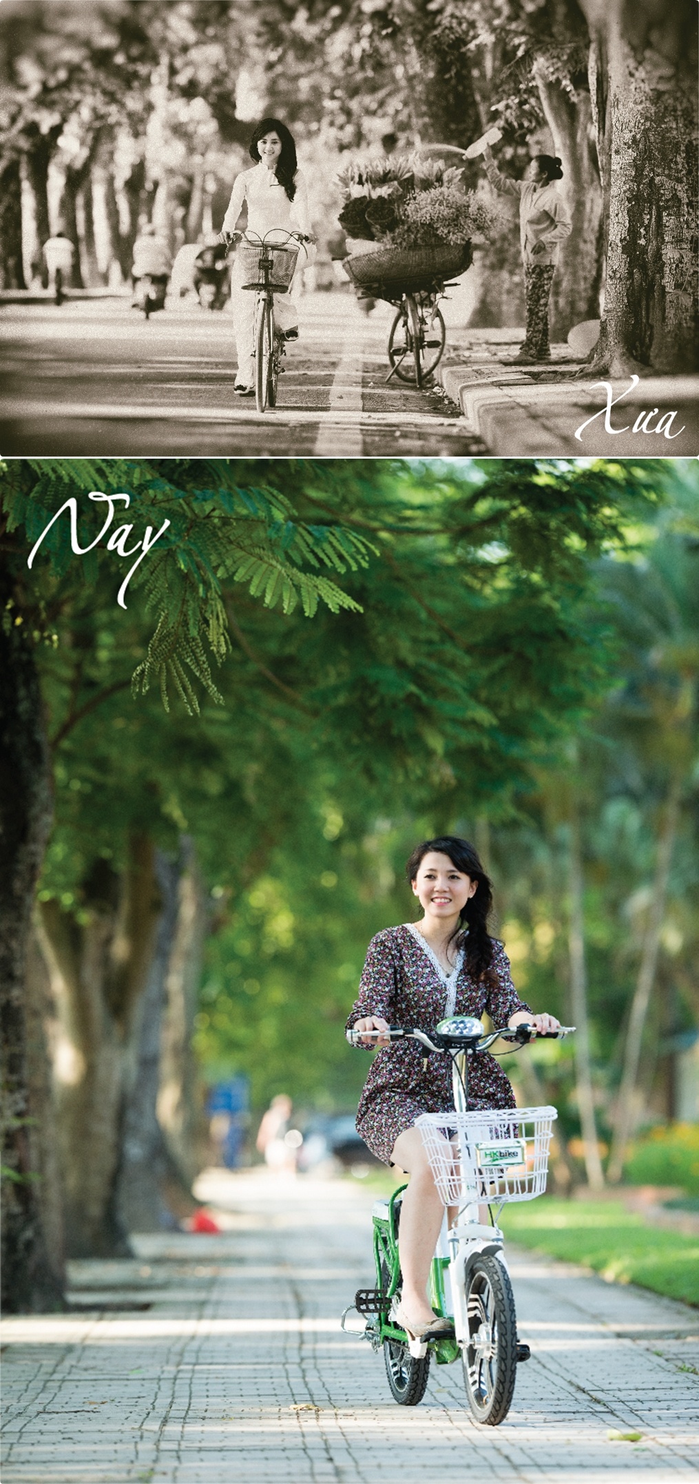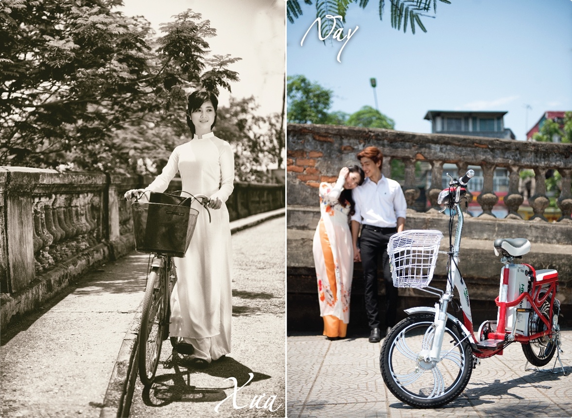 | Hình ảnh của thanh niên Hà Nội xưa gắn liền với sơ mi, quần tây, áo dài trắng giản dị và xe đạp Thống Nhất. Giới trẻ Hà Nội ngày nay vẫn chuộng những trang phục như sơ mi, quần tây, áo dài nhưng đã mang hơi hướng cách điệu và năng động hơn rất nhiều. Đặc biệt, chiếc xe đạp thông thường đã được thay thế bằng xe đạp điện, cụ thể ở đây xe đạp điện HKbike ứng dụng công nghệ pin Lithium-ion, cho phép di chuyển quãng đường lên tới 90km/lần sạc. Ngay sau khi chùm ảnh Hà Nội xưa và nay được công bố, giới trẻ hưởng ứng nhiệt tình, và đánh giá là rất có ý nghĩa, đặc biệt trong tháng 5 lịch sử này. |