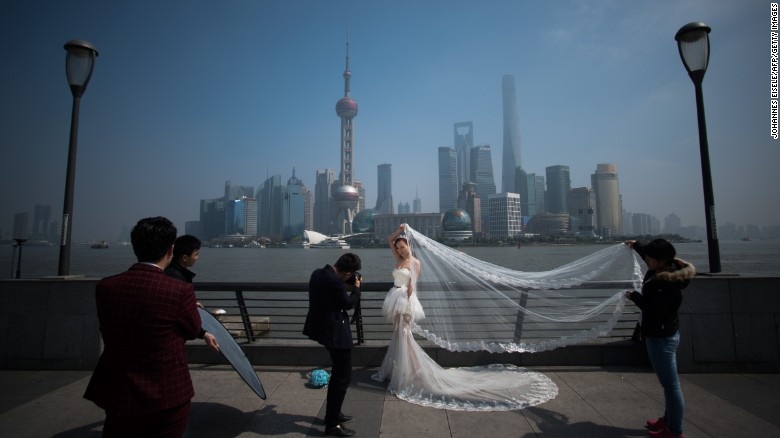| Một cô dâu cùng nhiếp ảnh gia chụp ảnh cưới ở phía trước khu Phố Đông, thành phố Thượng Hải, Trung Quốc. Ảnh: CNN |