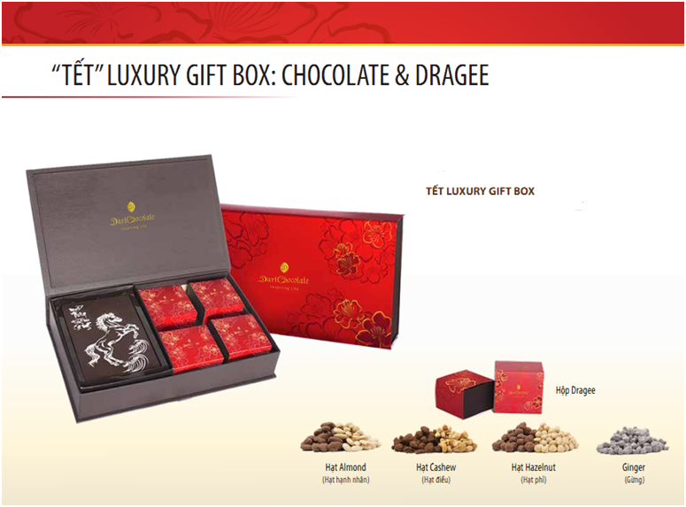 Nắm bắt được nhu cầu đó, D'Art Chocolate với công nghệ sản xuất hiện đại từ Áo và nguồn nguyên liệu chocolate tuyệt hảo từ Bỉ đã cho ra mắt những hộp quà Chúc Mừng Năm Mới thật ấn tượng, thay mặt bạn gửi lời chúc đến khách hàng của mình. Bên cạnh đó, kỹ thuật in chuyên nghiệp, không hóa chất độc hại trên nền chocolate có thể giúp doanh nghiệp chuyển tải logo, thương hiệu hay slogan của mình thông qua hộp quà được bao gói cẩn thận bằng chất liệu giấy cao cấp.