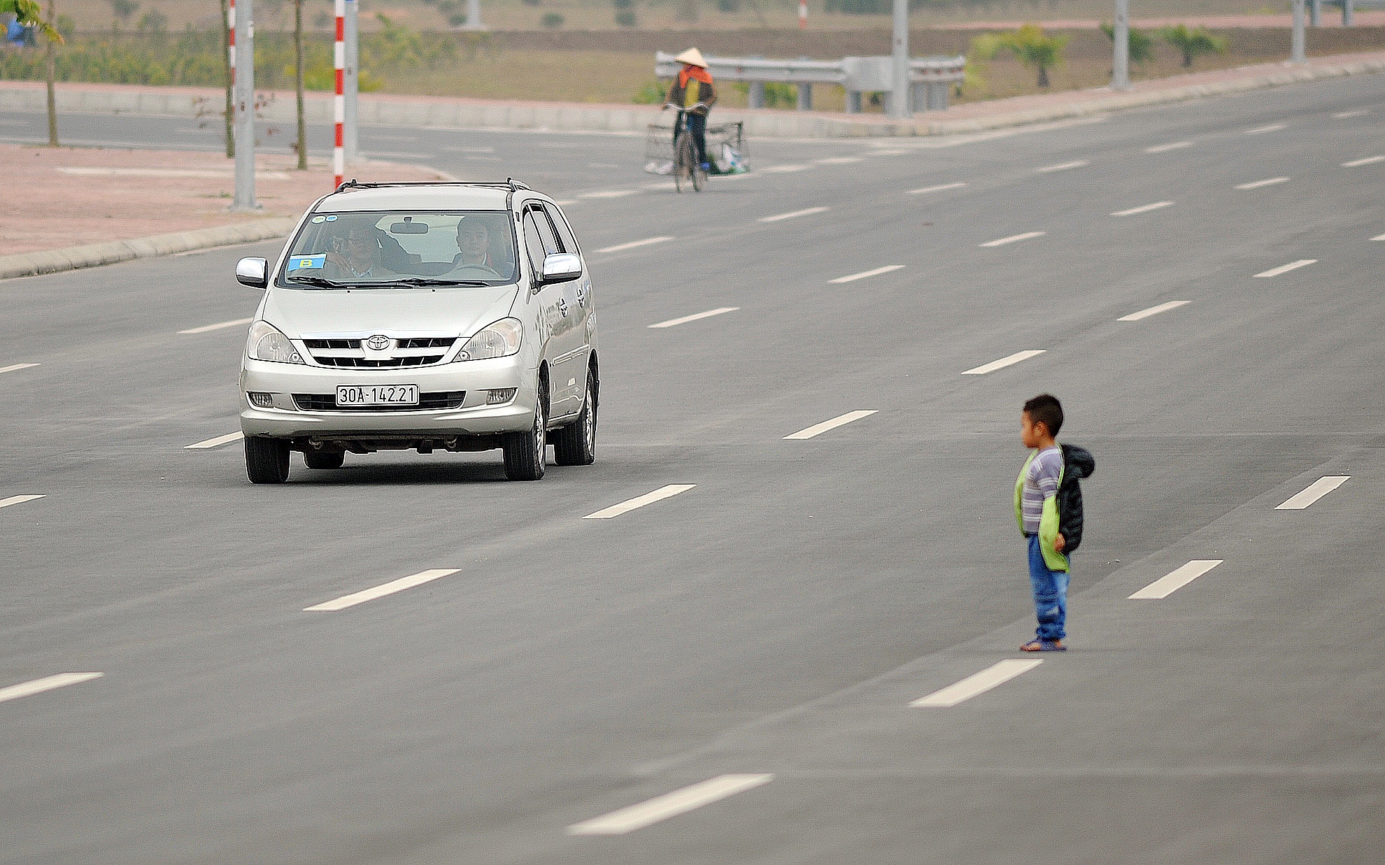 Một bé trai đứng thơ thẩn giữa làn xe cộ như thể trên con đường làng.